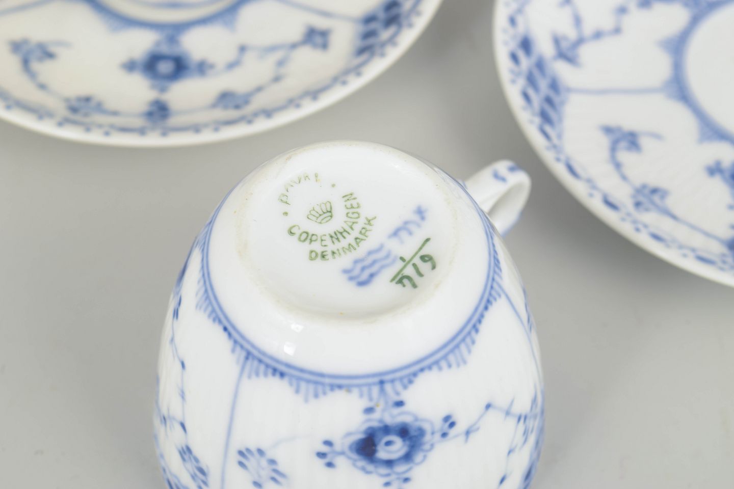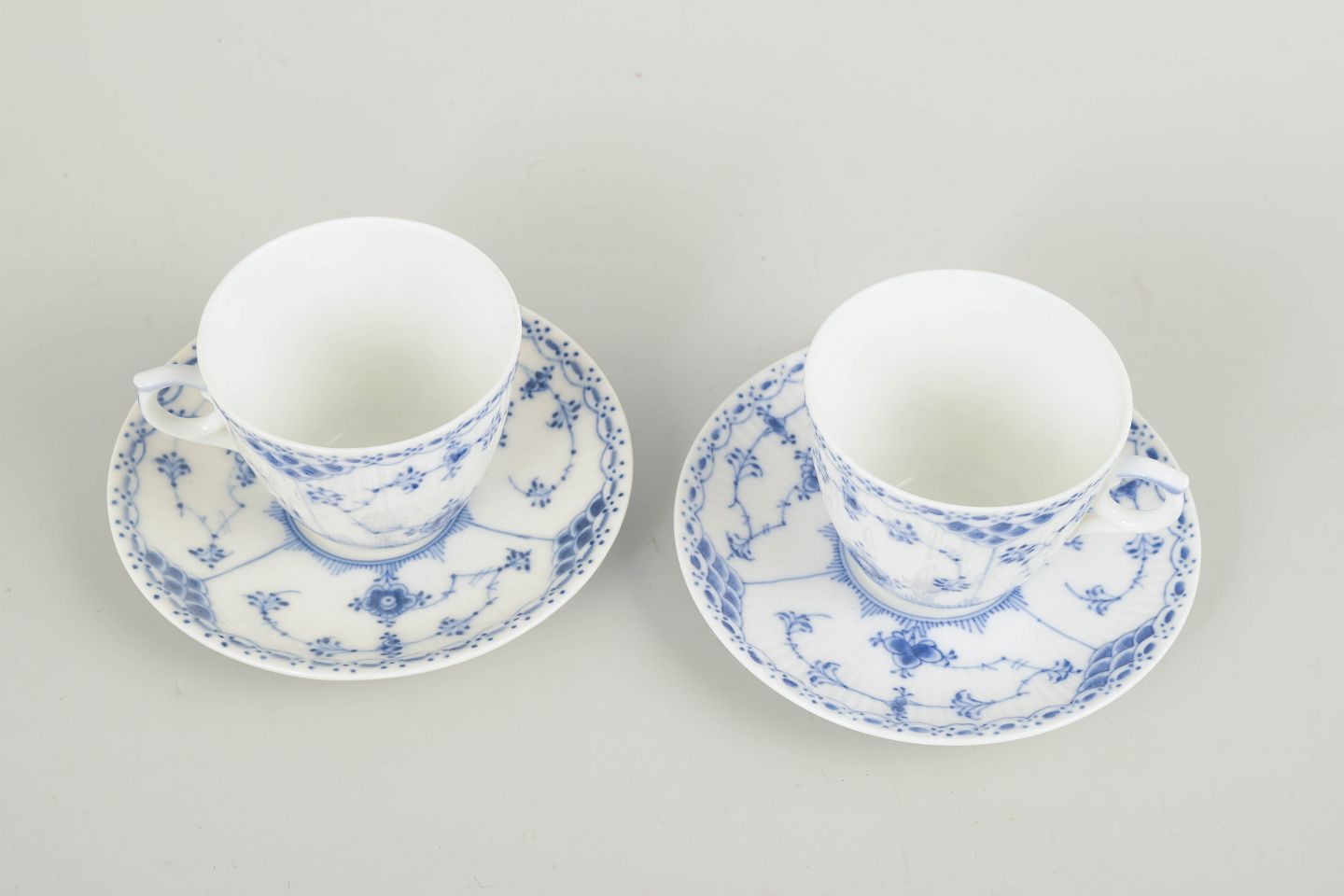 Sæt bestående af to kaffekopper med tilhørende underkopper i Musselmalet halvblonde. Klassiske riflede former med blondekant og håndmalet koboltblå dekoration. Et elegant kaffesæt fra mellemkrigstiden.