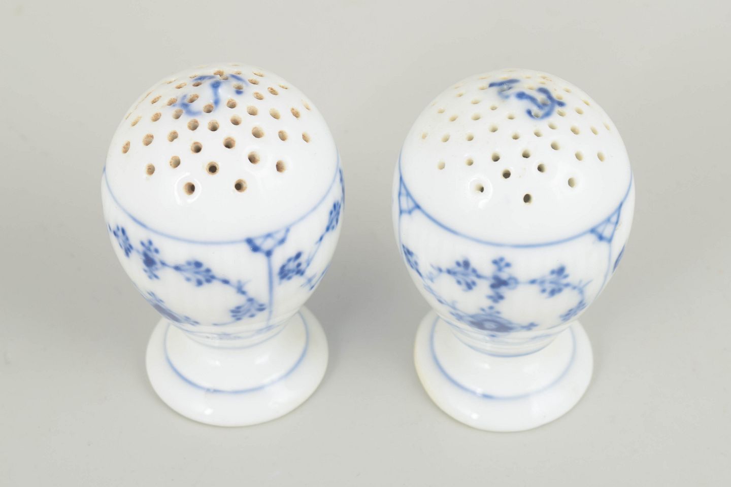 Antikt salt- og pebersæt i Musselmalet riflet, udført i klassisk riflet form og dekoreret med håndmalet koboltblå underglasur. De balusterformede beholdere med perforerede låg står på små fodstykker og fremstår som et elegant og funktionelt bordtilbehør fra århundredeskiftet, præget af håndværksmæssig kvalitet og tidløs formgivning.