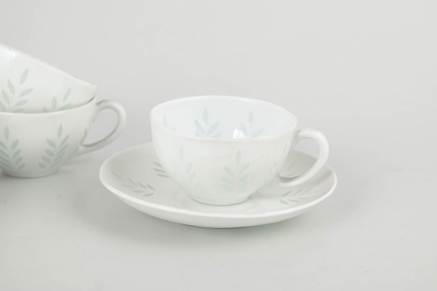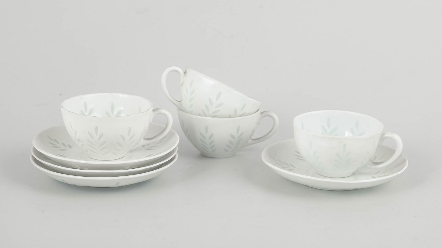 Elegant sæt bestående af fire mokkakopper med tilhørende underkopper i hvidt porcelæn, dekoreret med diskret bladornamentik udført i transparente, let grønligt tonede glasurfelter. Det lette og harmoniske udtryk kombineret med de bløde former er karakteristisk for Friedl Holzer-Kjellbergs sene porcelænsproduktion for Arabia.
