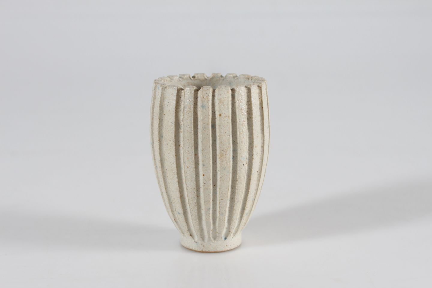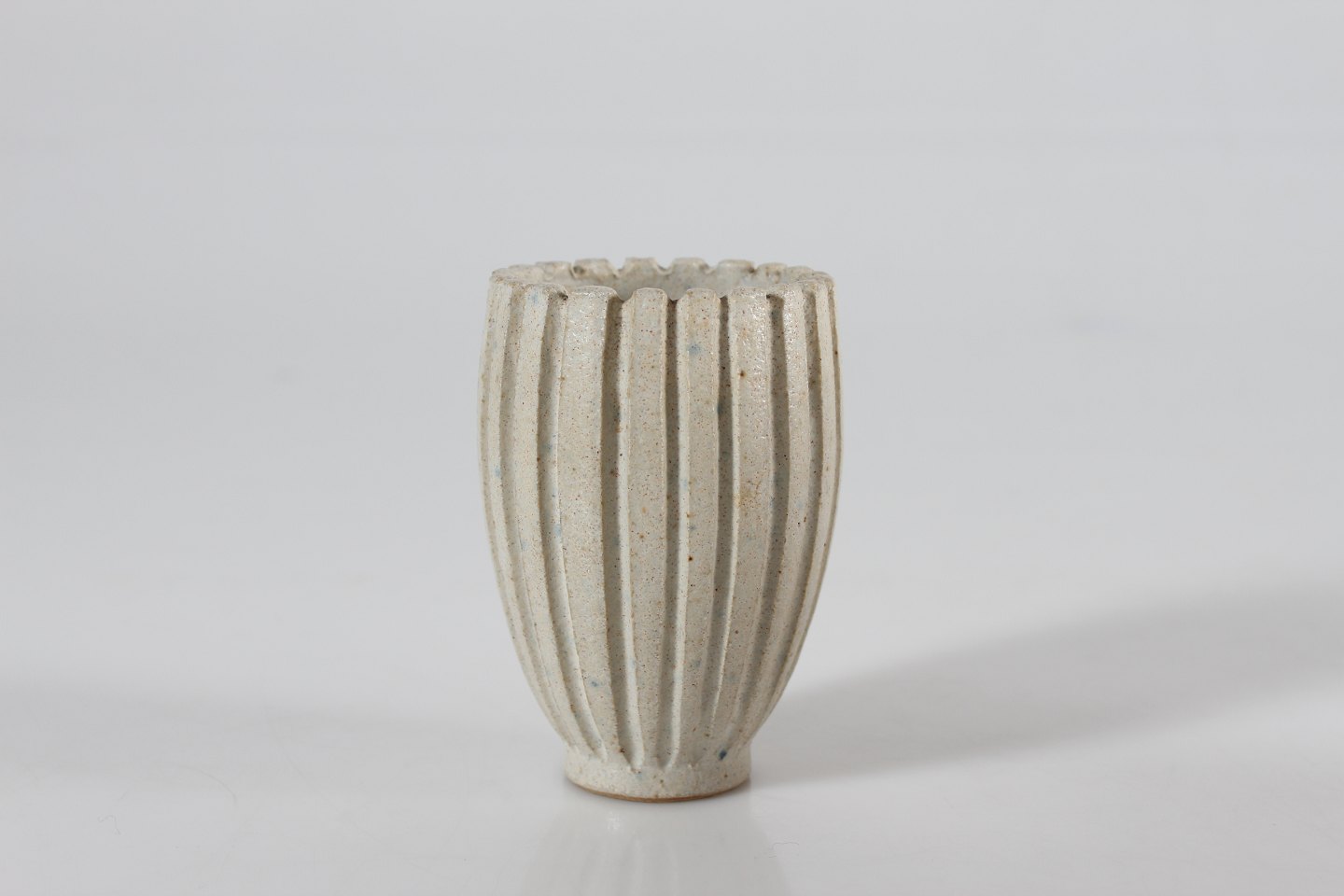 Lille Art Deco vase i rillet stil af sandfarvet stentøj