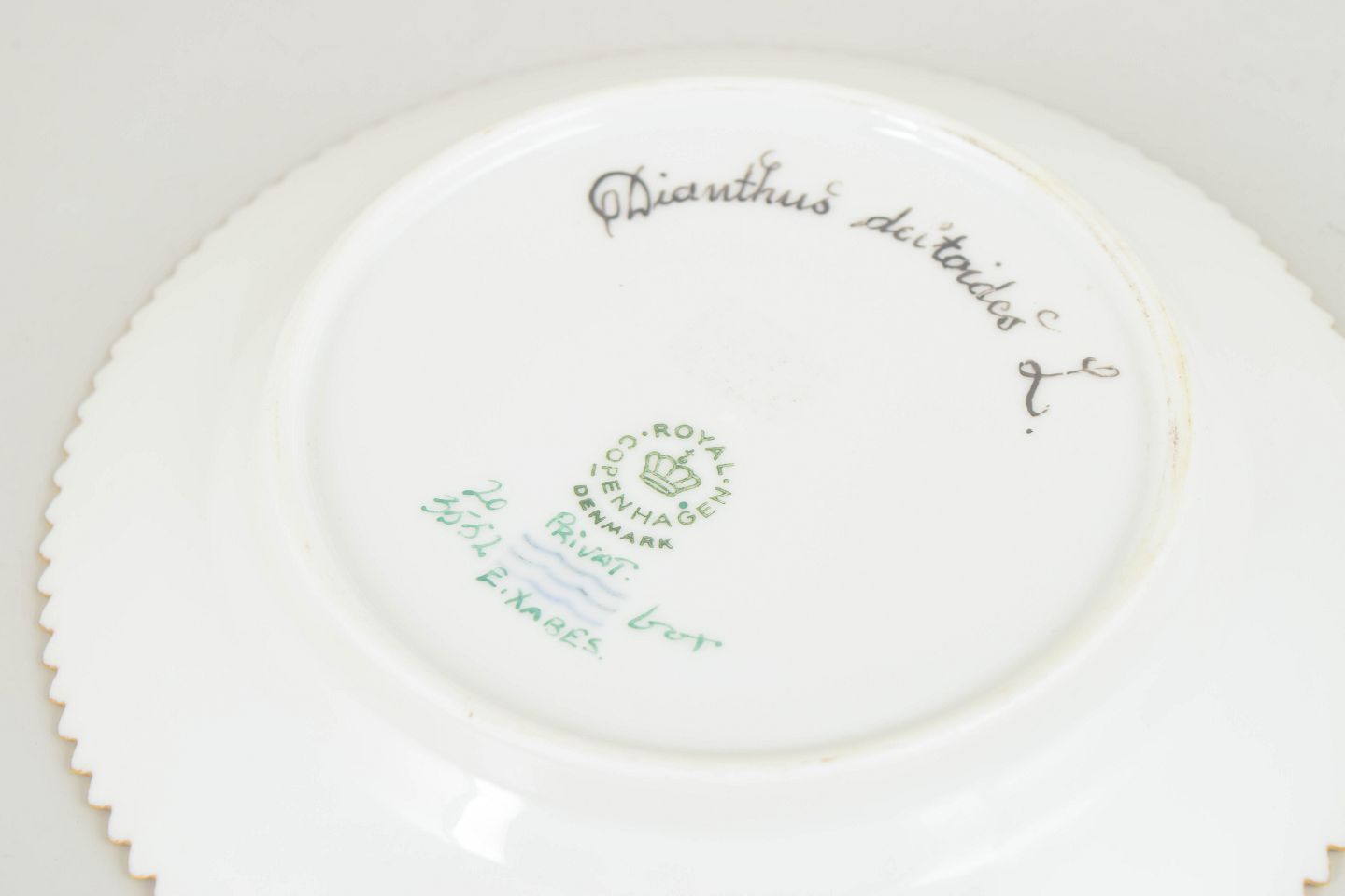 Elegant sidetallerken i det ikoniske Flora Danica-stel, håndmalet med botanisk motiv gengivet efter Flora Danica-værket. Tallerkenen er udført med den karakteristiske form og forfinede kant, som kendetegner stellets eksklusive og klassiske udtryk.