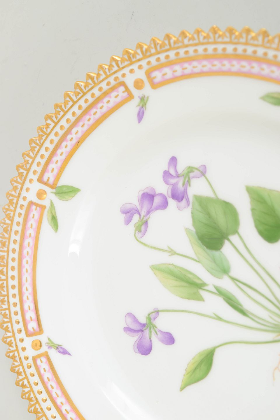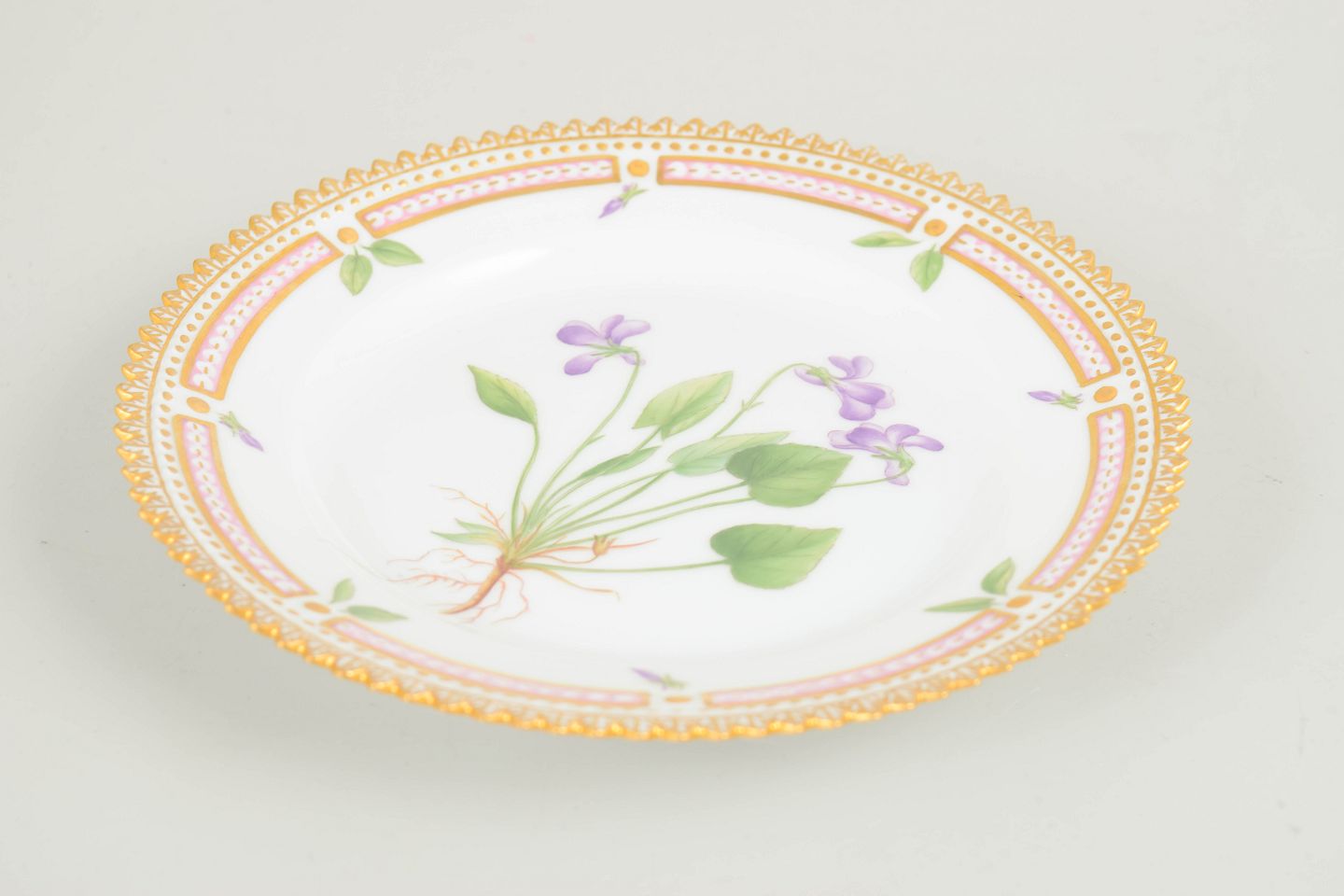 Elegant sidetallerken i det ikoniske Flora Danica-stel, håndmalet med botanisk motiv gengivet efter Flora Danica-værket. Tallerkenen er udført med den karakteristiske form og forfinede kant, som kendetegner stellets eksklusive og klassiske udtryk.
