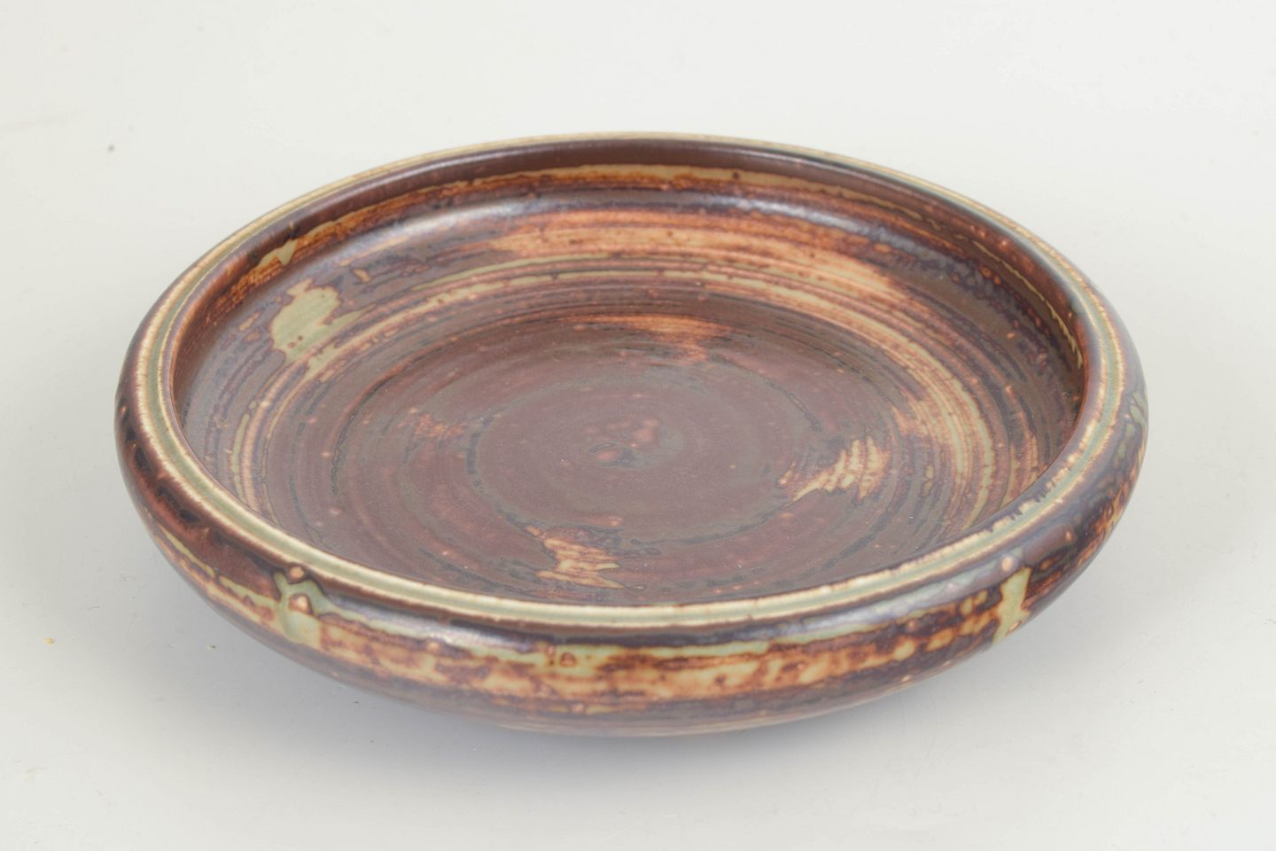 Lav, bred skål udført i stentøj med markant koncentrisk drejestruktur og dyb, levende glasur i mørke jordfarver med brune, sorte og varme okkerfarvede gennembrud. Overfladen fremstår taktil og grafisk med tydelige drejespor, som giver skålen et kraftfuldt og karakterfuldt udtryk.