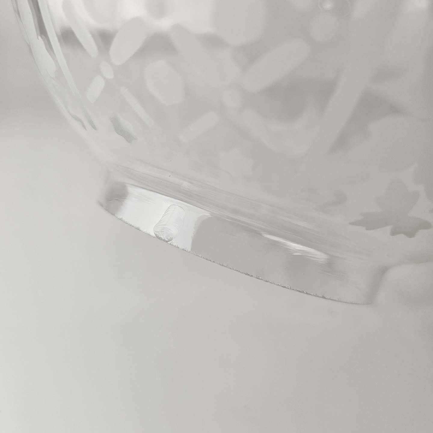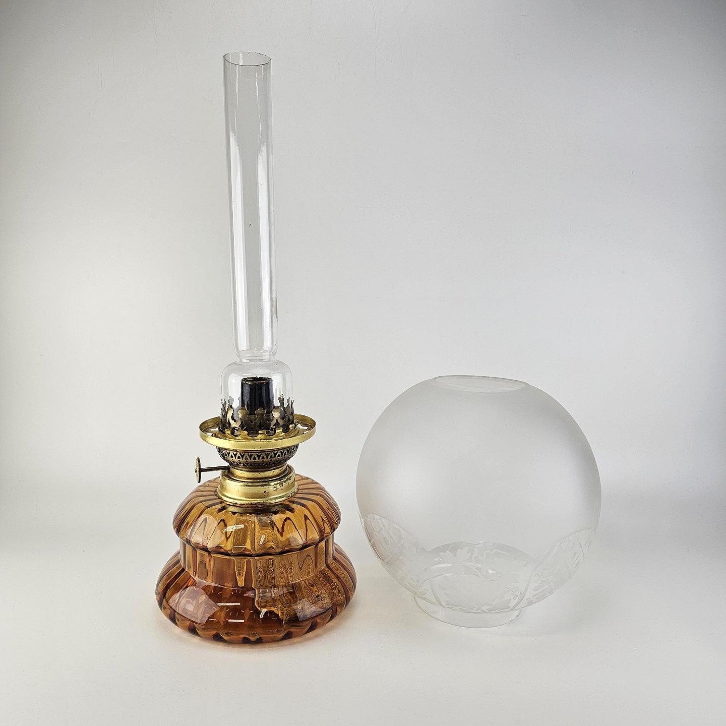 Glas ravfarvet petroliumslampe til bord model Dagmar Maxi med glasrør og rund kuppel i klar glas. Lille afslag på kuppelskærm i fod, som ikke ses.