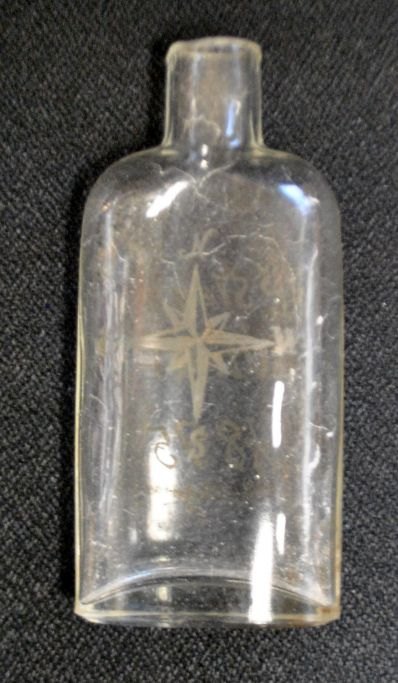 Glass flask, 1895. Engraved with name and compass. L: 13 cm.