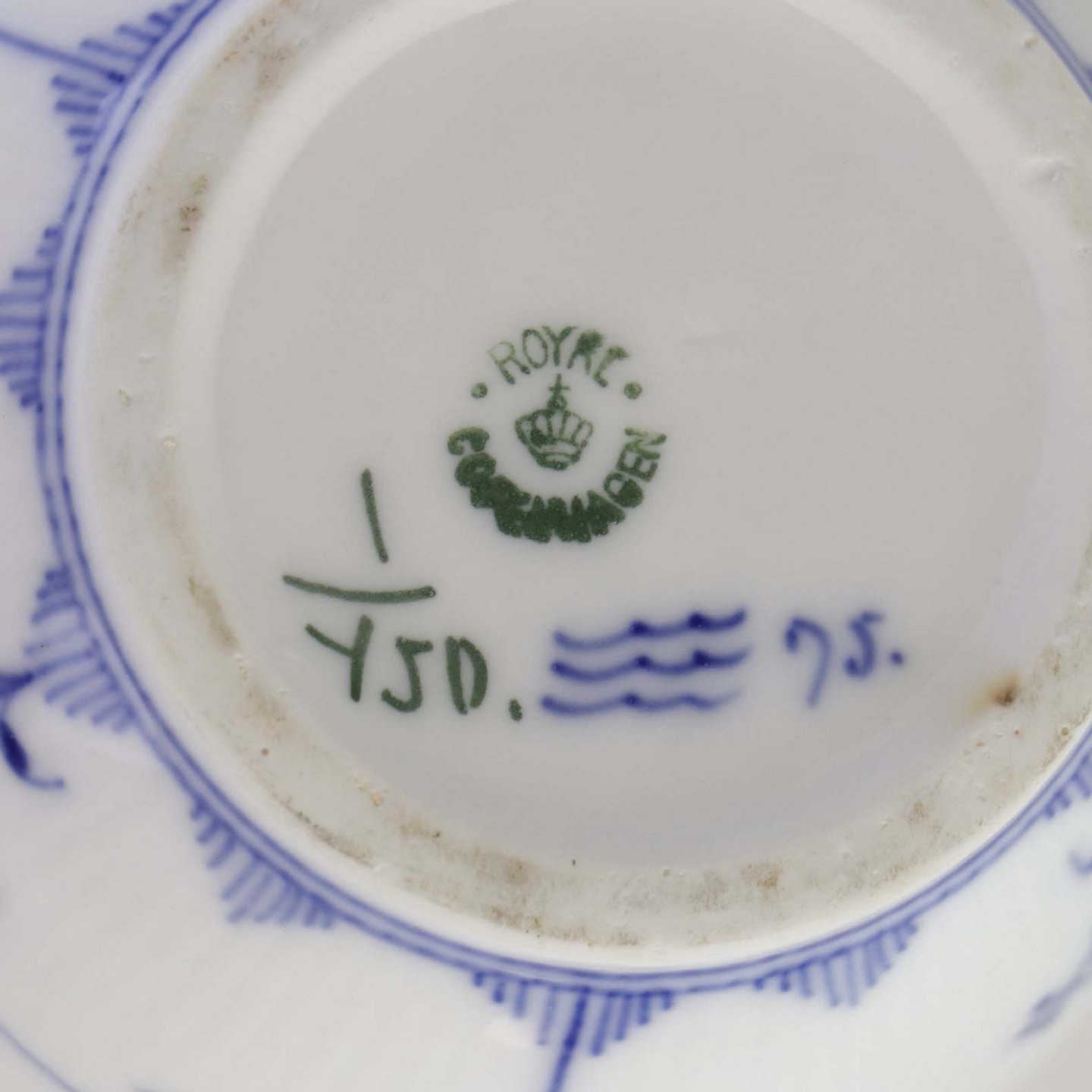 Musselmalet er af kongeligt hvidt porcelæn, dekoreret med rifler og mønster af blå ranker og blomster.