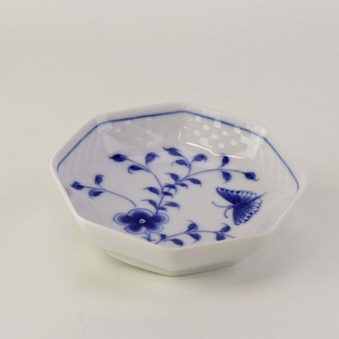 Service i hvidt skælformet porcelæn med blå motiver af blomster og sommerfugle.