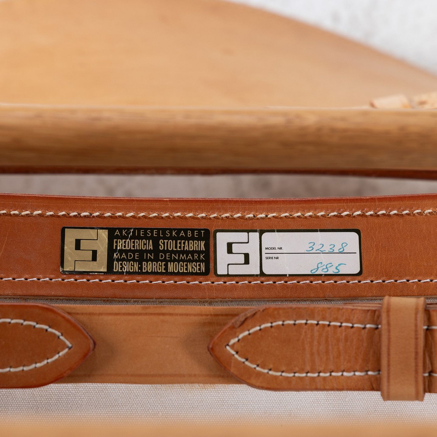 BM 3238 - 'Jagtstol' i patineret egetræ og kernelæder m. armlæn. Mærket fra producent.