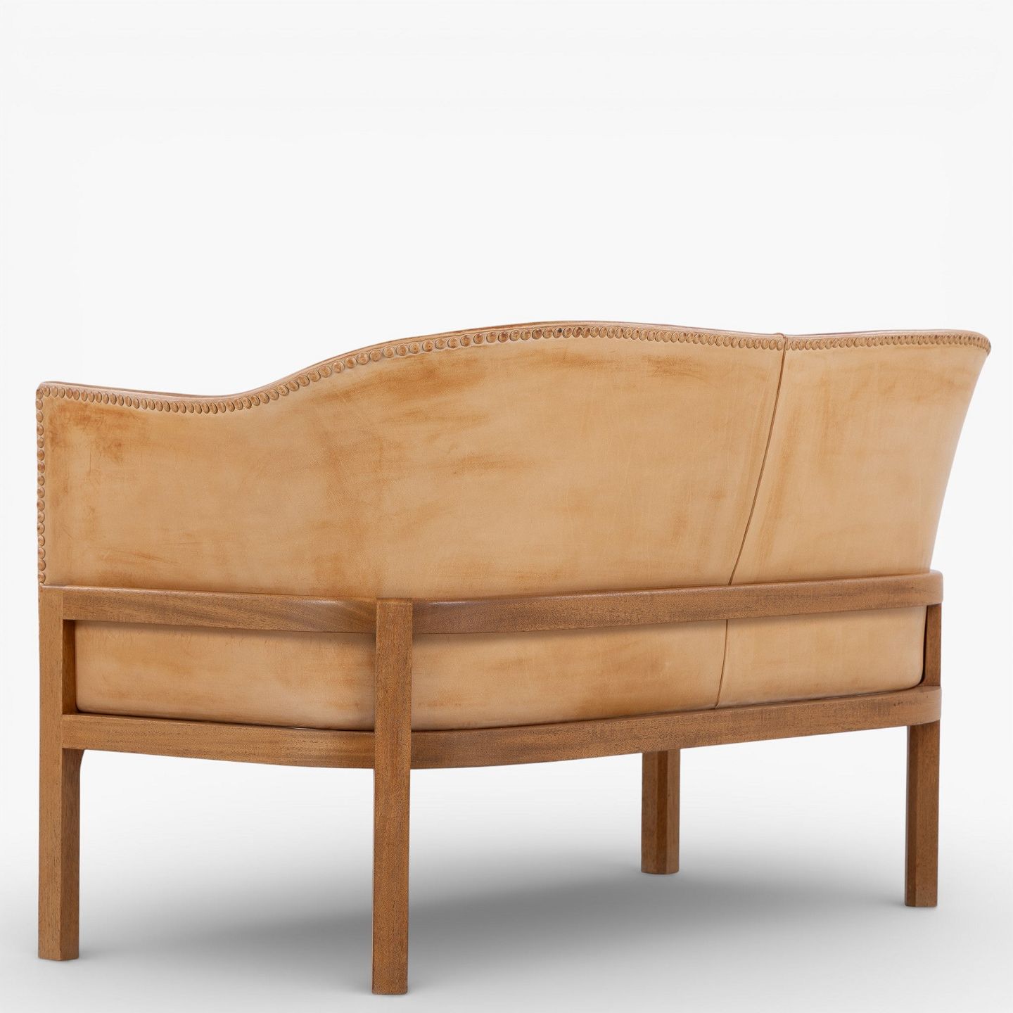 MK 52/2 - 2 pers. sofa i patineret sømbeslået naturlæder med stel i mahogni.