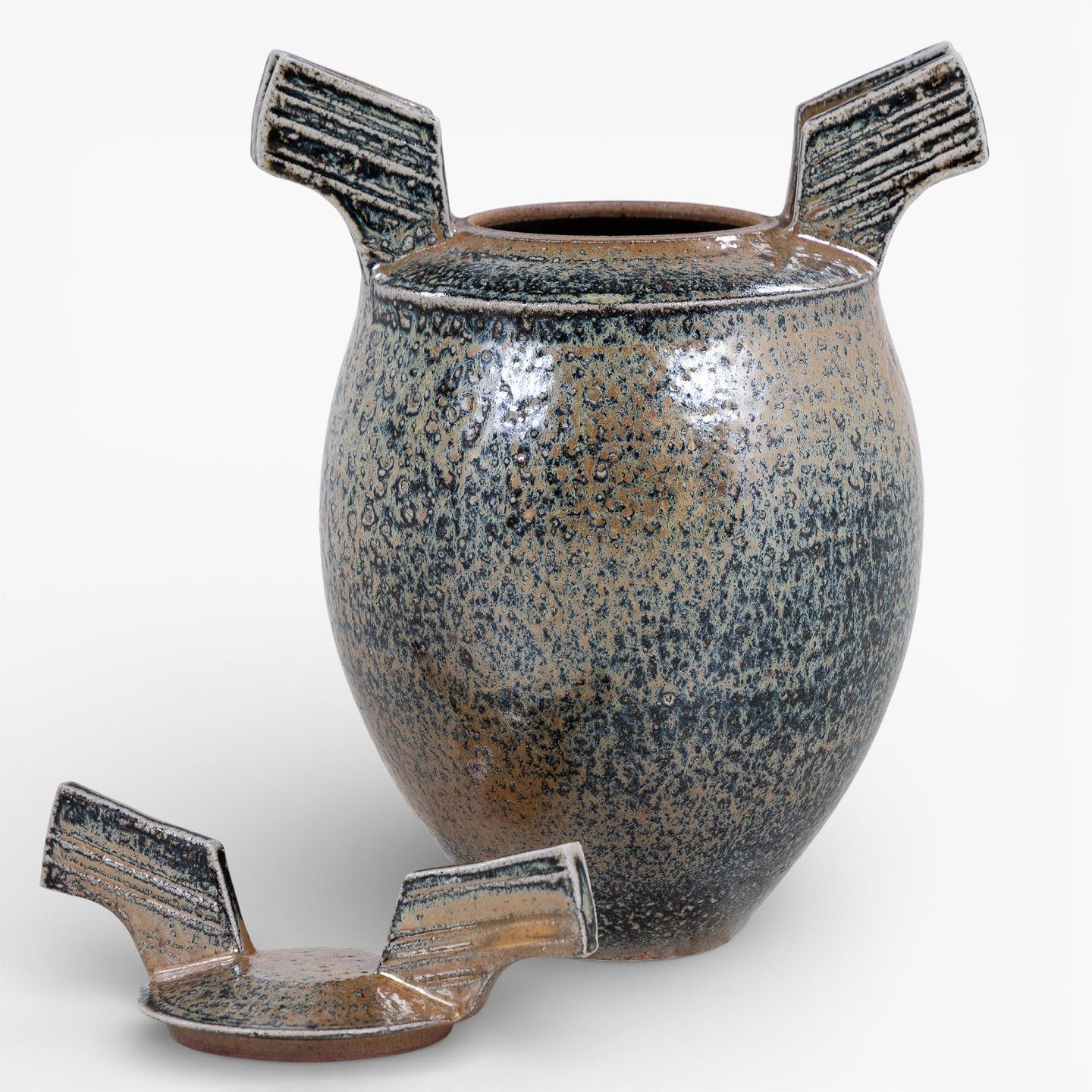 Unik lågkrukke i stentøj med brun saltglasur. Signeret 'Birck 85'.