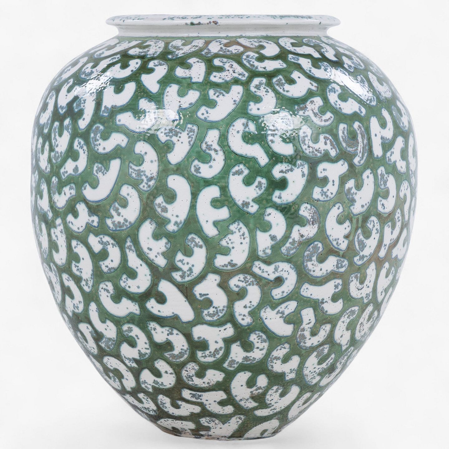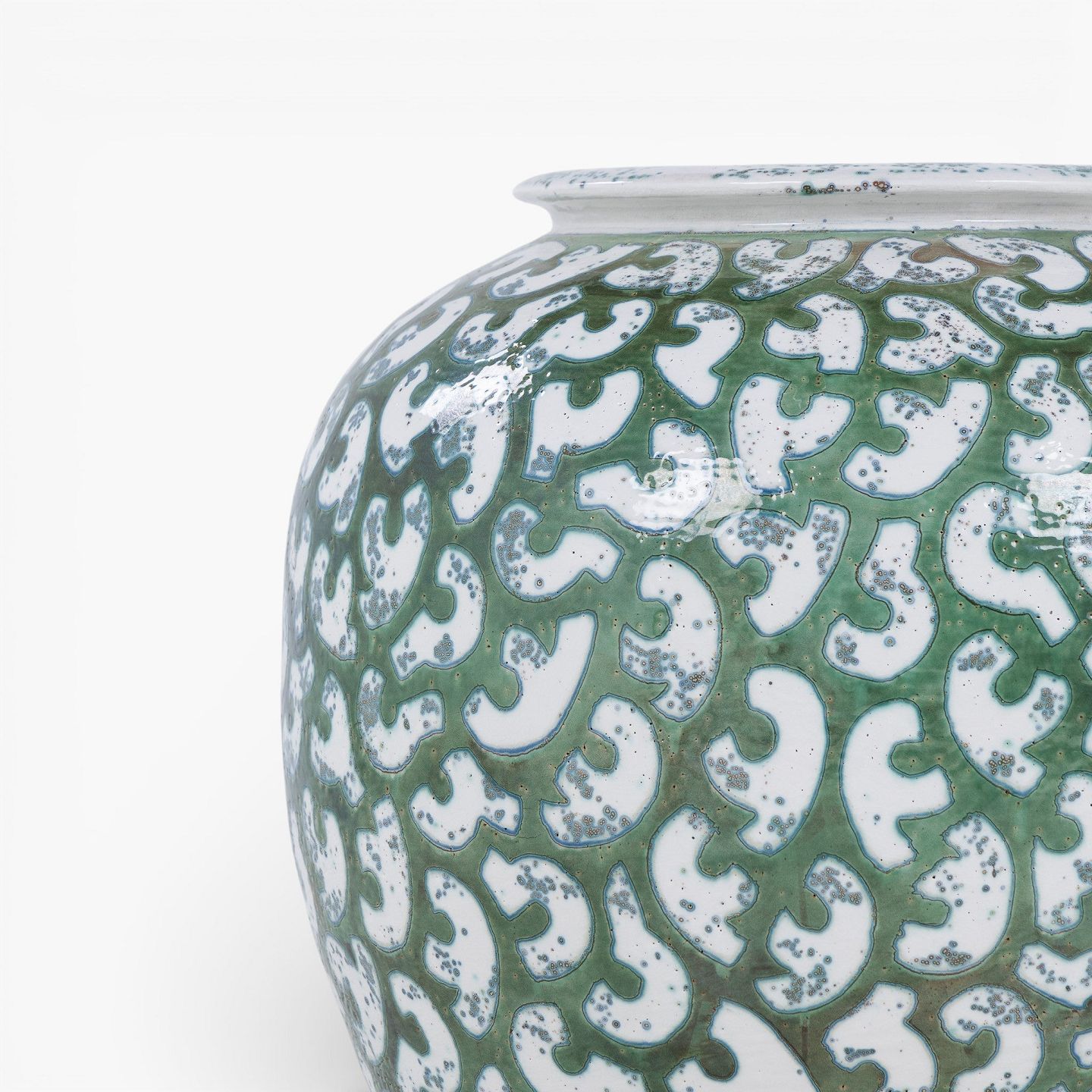 Kolossal krukke i stentøj med grøn glasur og hvide stafferinger. Signeret.