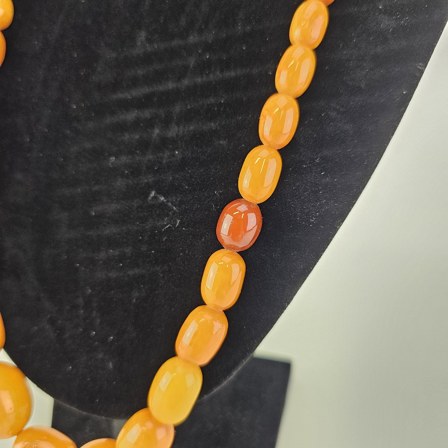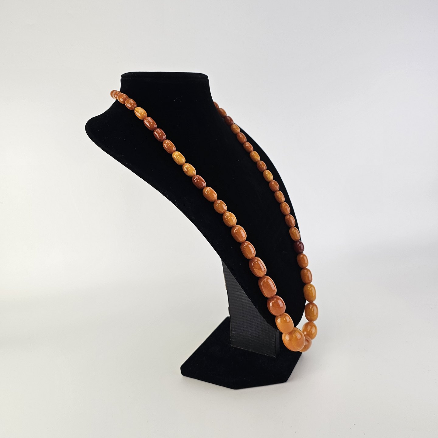 Halskæde med perler af glatslebet rav i varierende størrelse på snor, i alt 54 stykker rav