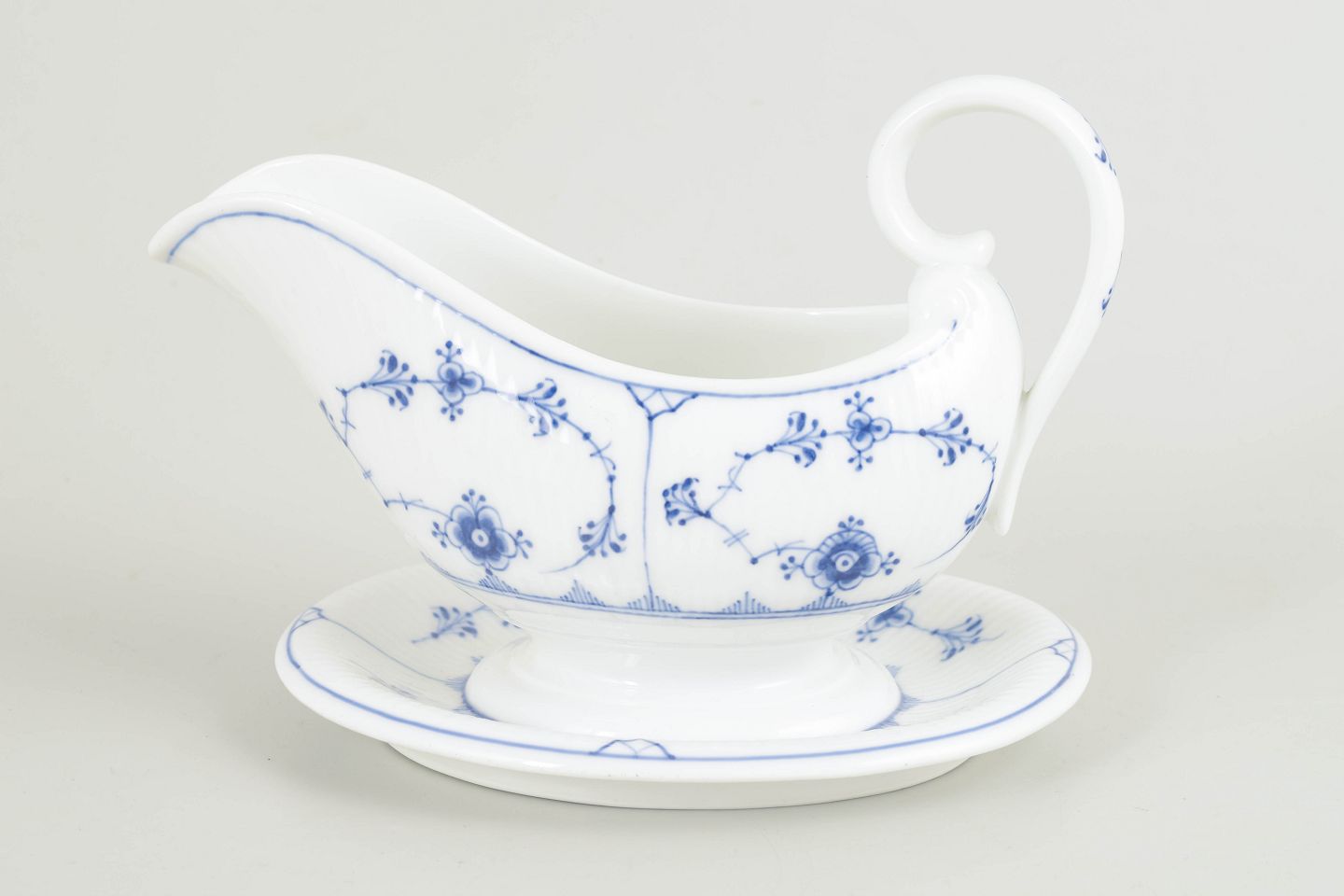 Blue Fluted Plain er Royal Copenhagens ældste stel, introduceret i 1775. Den riflede form kombineret med håndmalet underglasurdekoration har gennem generationer været et kendetegn for dansk porcelænshåndværk. Saucebåde som denne indgik naturligt i det formelle middagsbord omkring år 1900 og vidner om stellets funktionelle elegance og tidløse udtryk.
