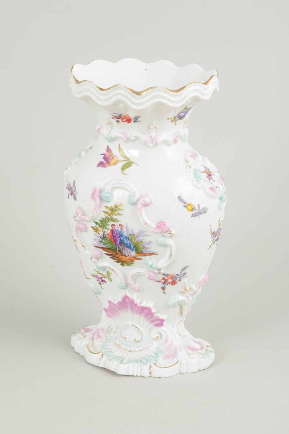 Sjælden vase i hvidt porcelæn rigt dekoreret i relief og med håndmalede polykrome blomster- og landskabsmotiver. Profileret fod og bølget munding. Et fint eksempel på Meissens dekorative porcelænskunst fra det tidlige 19. århundrede.