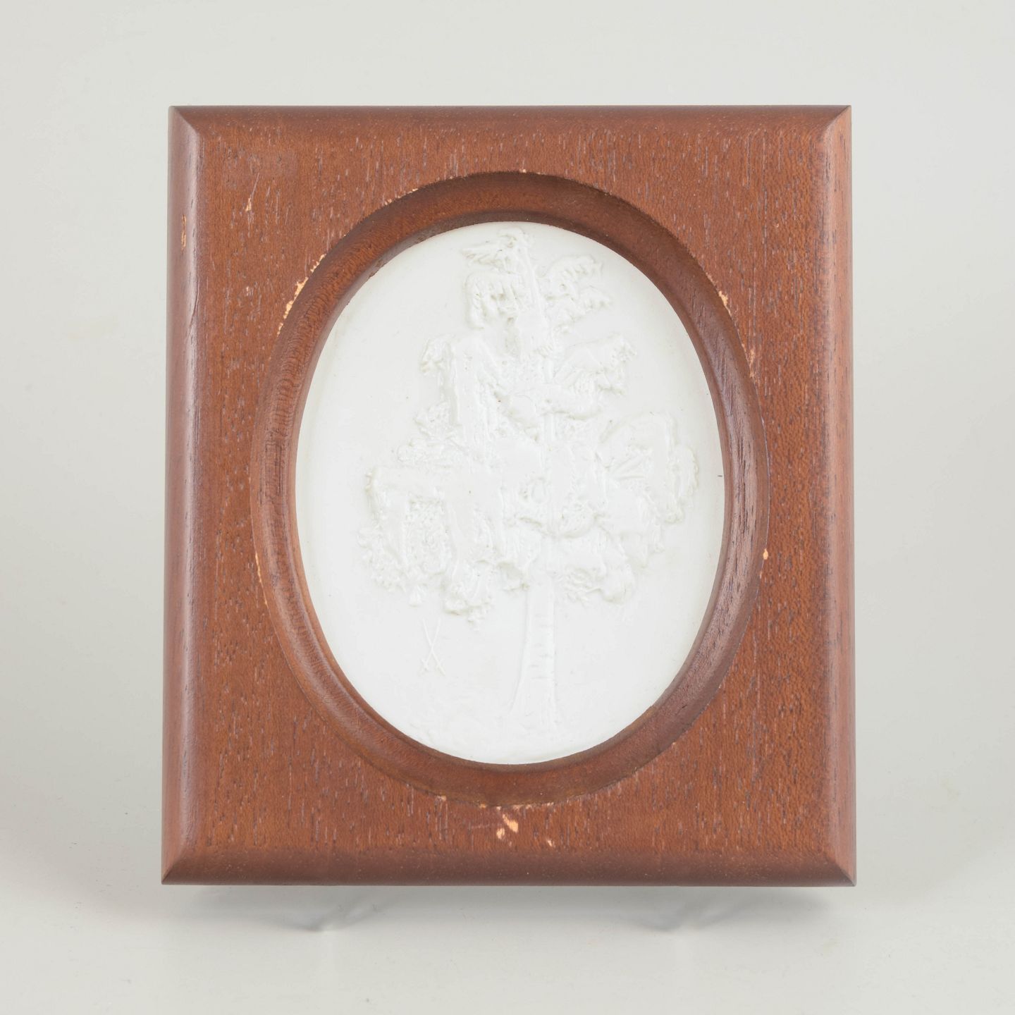 Reliefplakette i hvid biscuit porcelæn med naturalistisk træmotiv, monteret i rektangulær træramme med ovalt udsnit. Den matte biscuit overflade fremhæver relieffets fine detaljer og giver et roligt, klassisk udtryk.