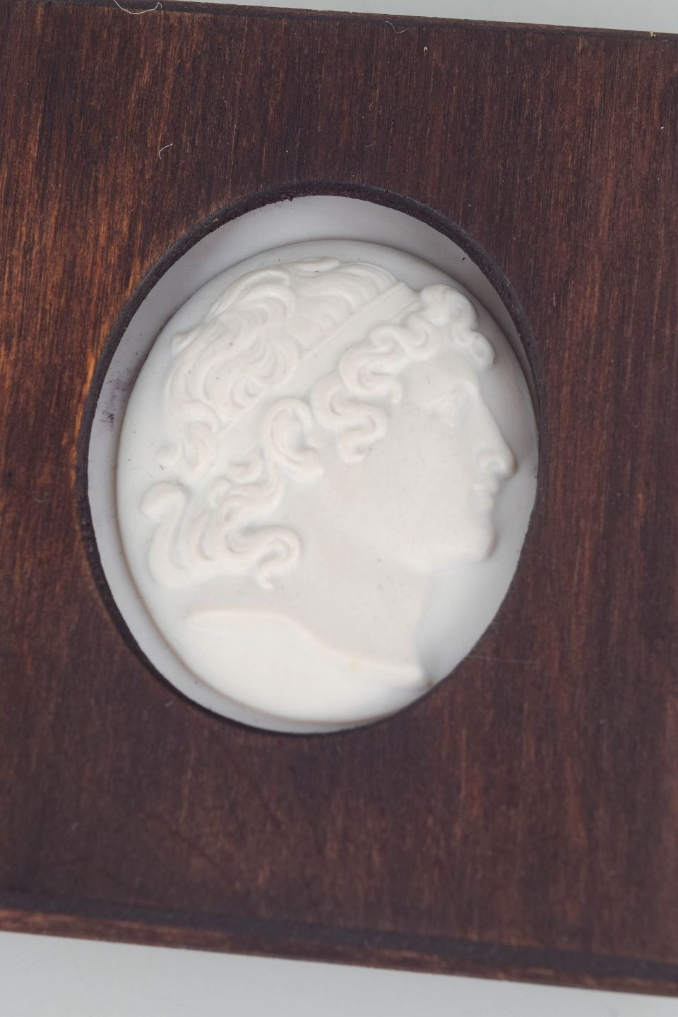 Lille reliefplakette i hvid biscuit porcelæn med klassisk profilportræt, monteret i kvadratisk træramme med ovalt udsnit. Den matte biscuit overflade fremhæver de bløde linjer i ansigt og hår og giver et roligt, skulpturelt udtryk.