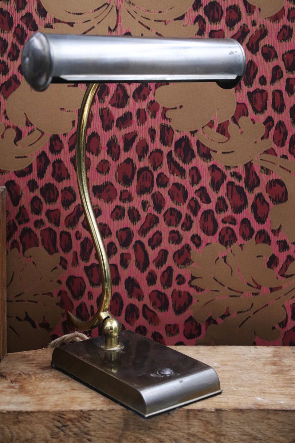 Gammel skrivebordslampe i patineret messing.
