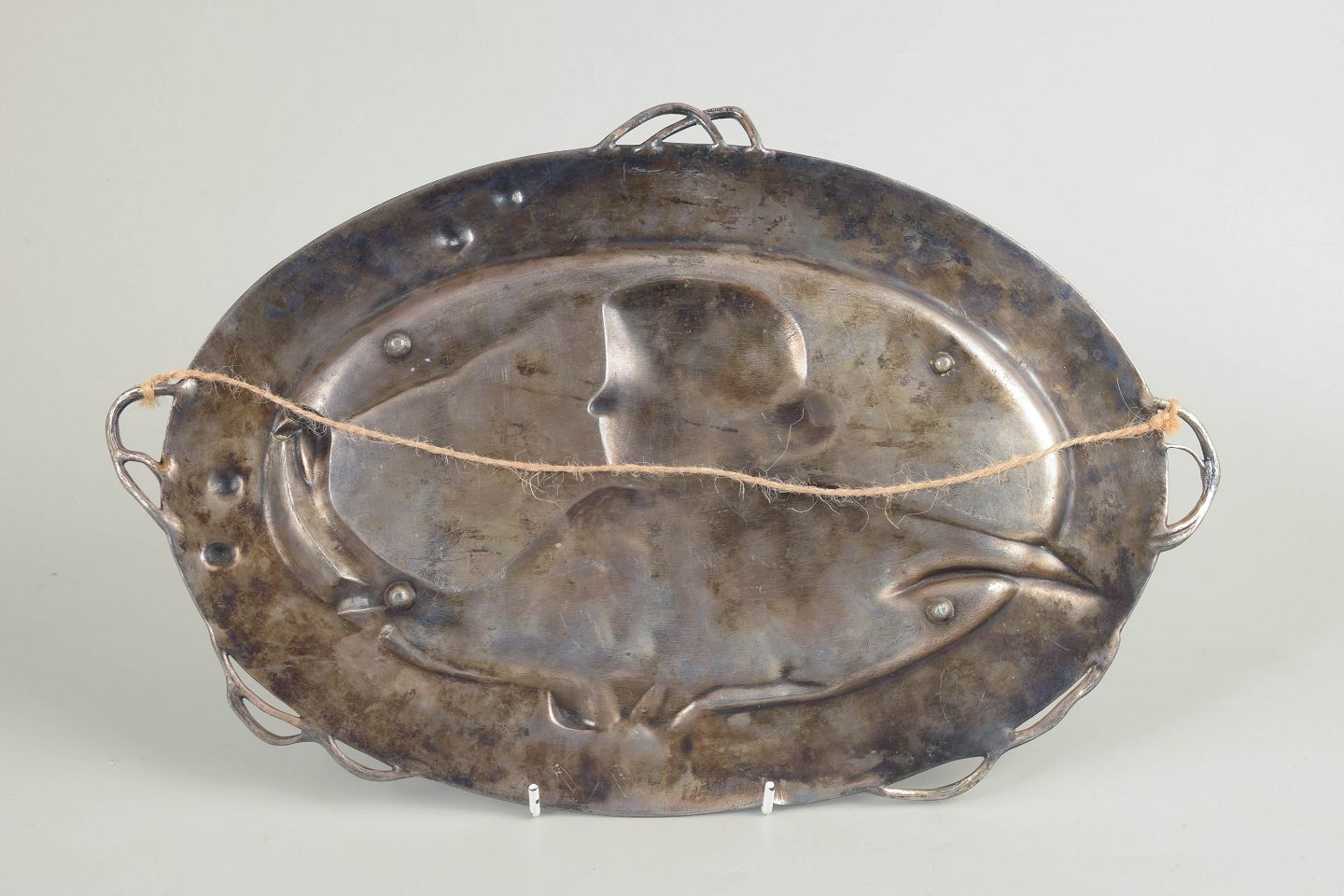 Stort ovalt fad i sølvfarvet metal med reliefdekoration i klassisk jugendstil, forestillende en kvindefigur omgivet af slyngende blomster og blade. Elegant, skulpturel komposition med fine detaljer og blød linjeføring, karakteristisk for WMF’s produktion i perioden. Kan anvendes både som serveringsfad og som vægophæng. Signatur forekommer, men er ikke tydeligt læsbar.