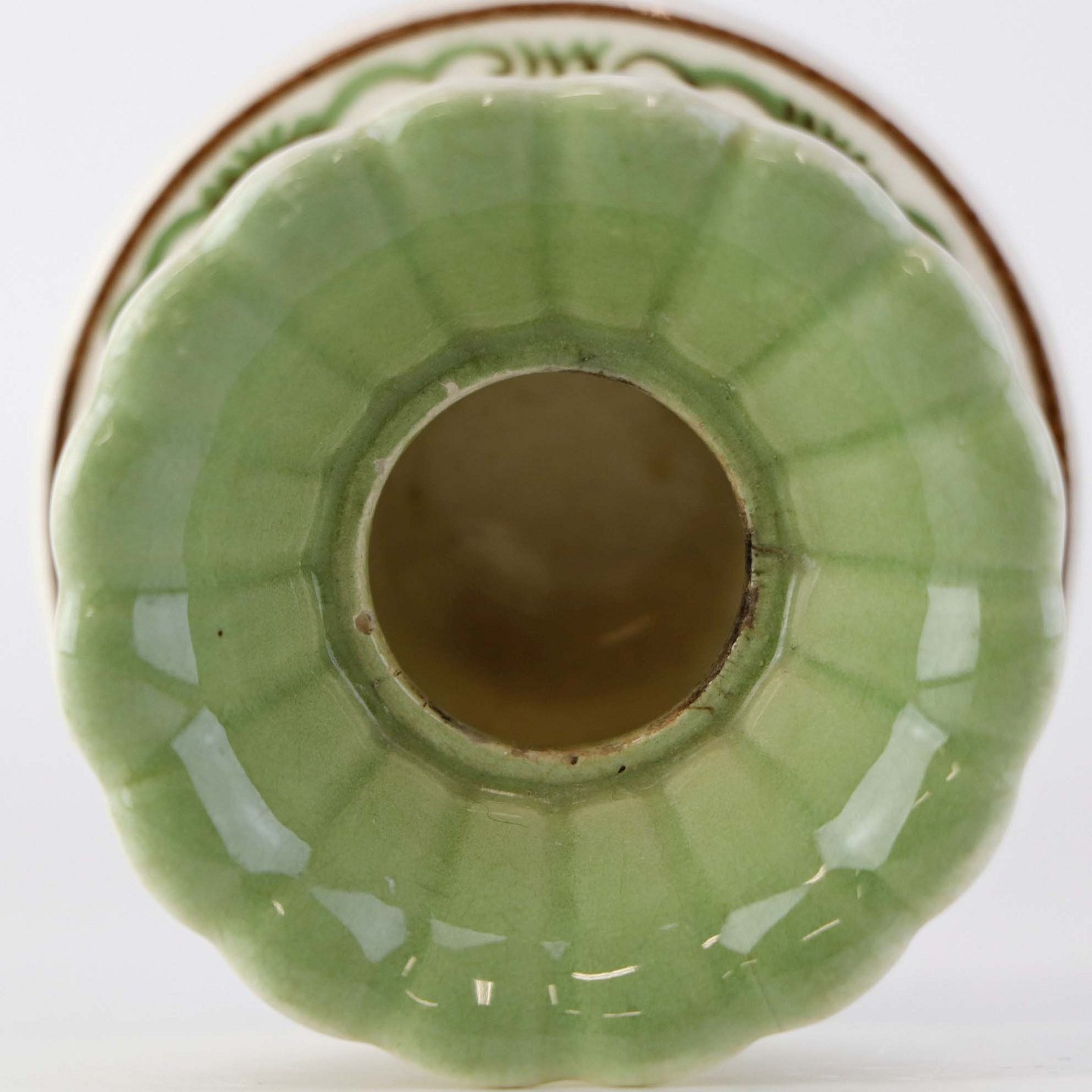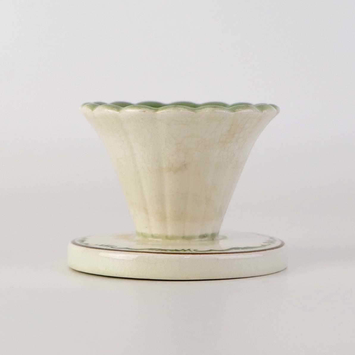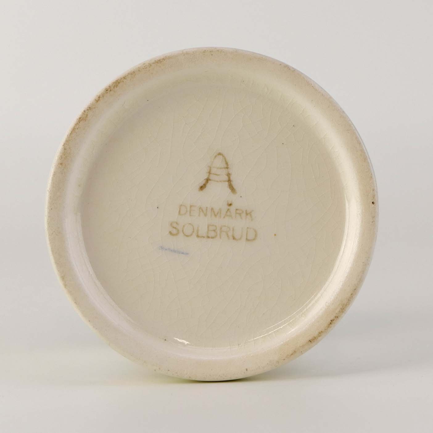 Fremstår med ujævnheder i bundkanten af stagen samt krakkeleringer i glasuren.