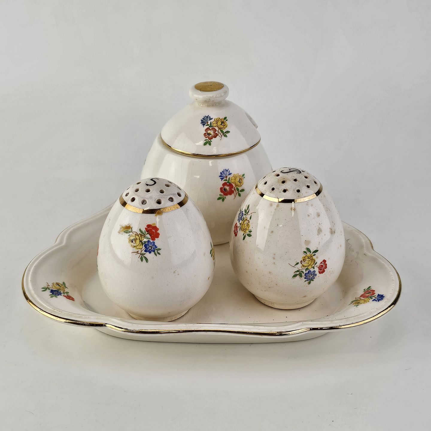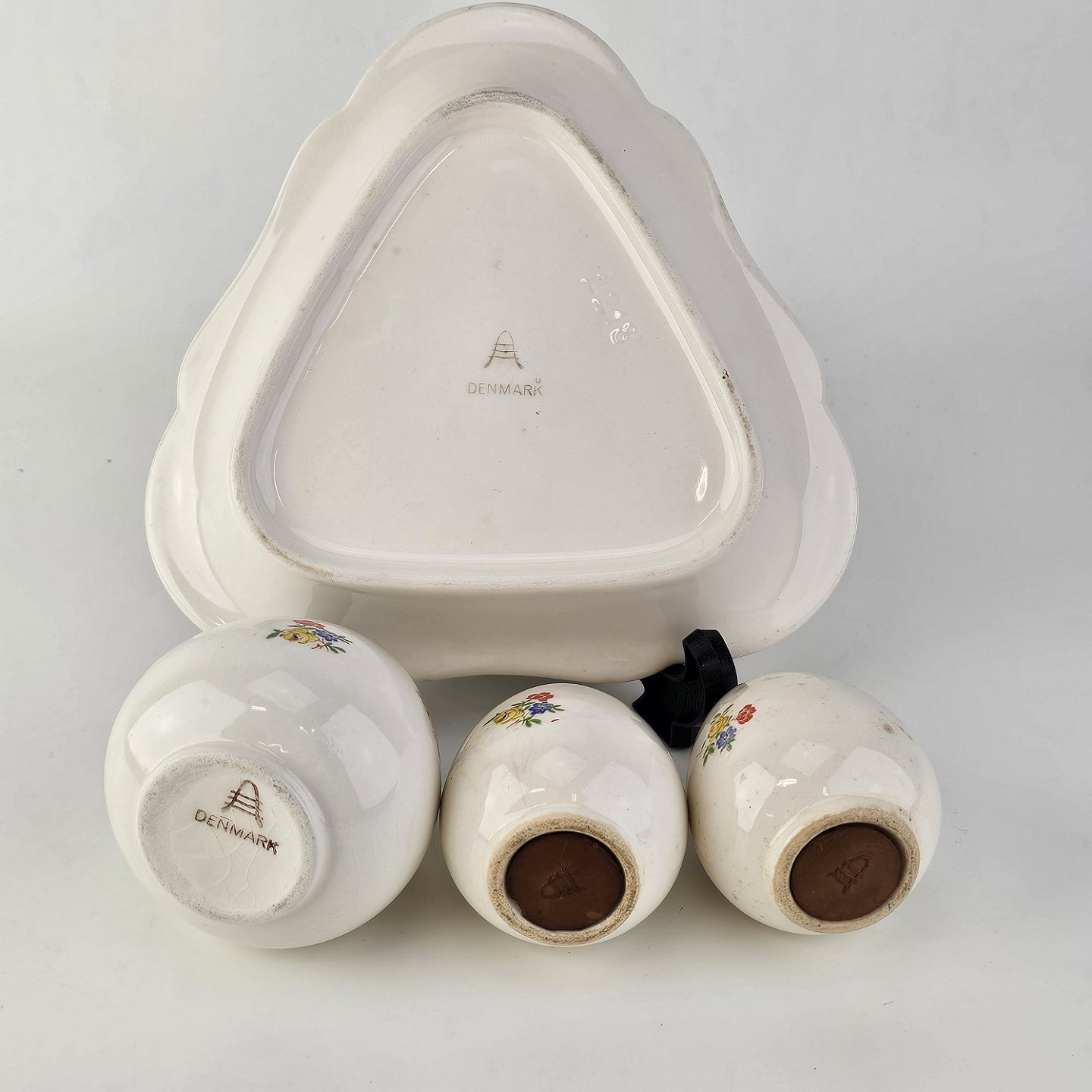 Trekantet fad med sennepskrukke, saltbøsse og peberbøsse i fajance fra stellet Anna Sofie