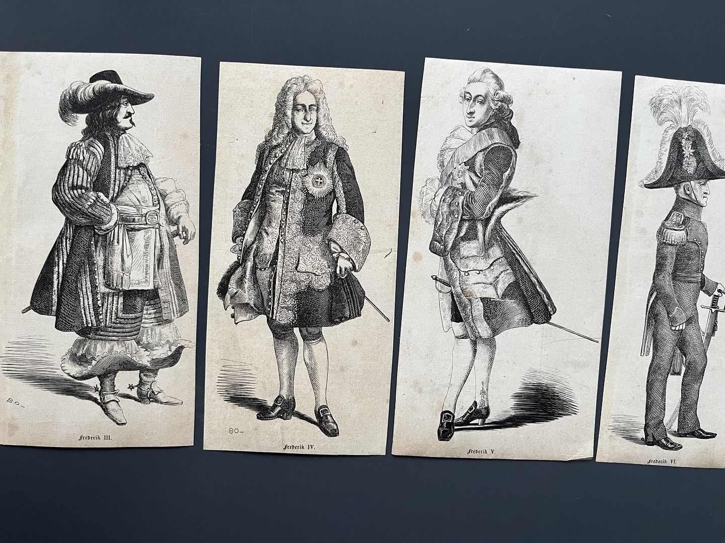 4 Xylografier af Bernhard Olsen - DH Kong Frederik III, IV, V og VI.
