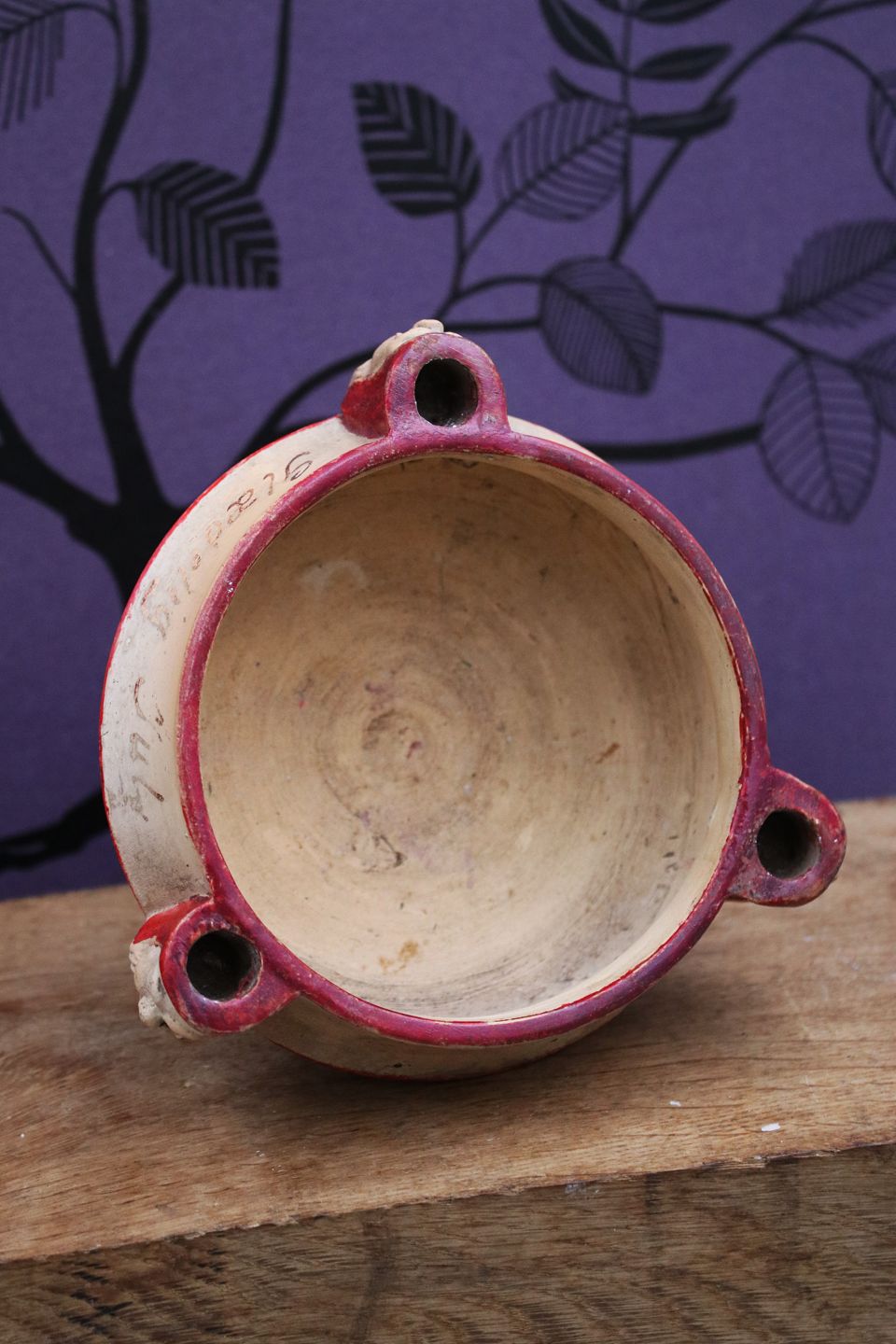 Fin , gammel jule skål i terrakotta dekoreret med 3 små nisse hoveder hvor der er plads til 3 små julestearinlys.