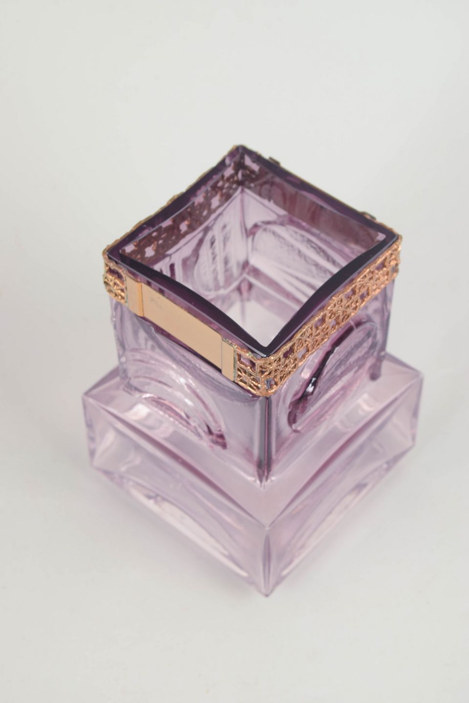 Skulpturel vase i lys violet mundblæst kunstglas med markant geometrisk form og dekorativ metalbort ved åbningen. Designet kombinerer massiv, facetteret glasopbygning med en fin, gennembrudt metalramme, hvilket skaber en tydelig kontrast mellem tyngde og lethed.