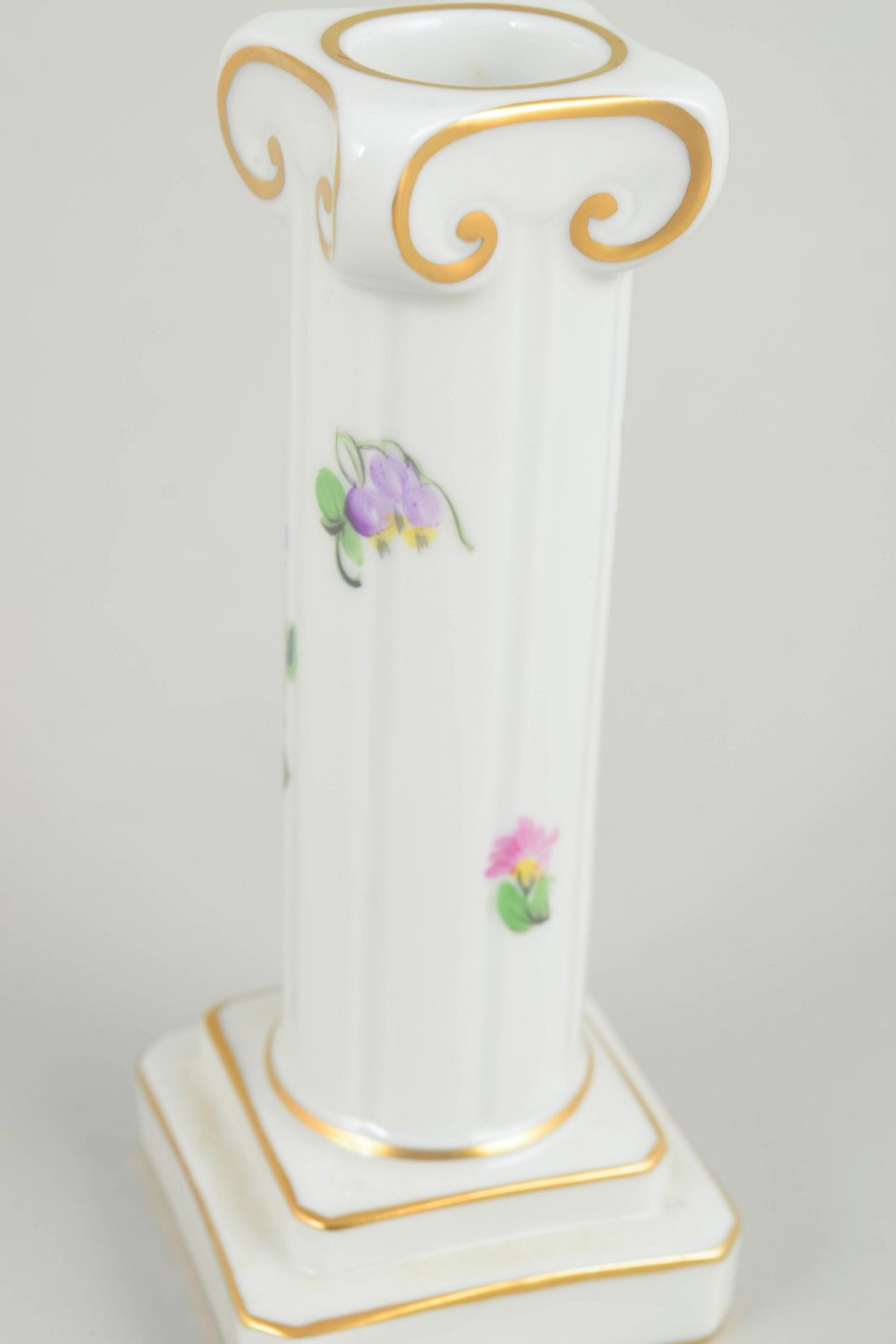 Håndmalet lysestage i glaseret porcelæn med blomsterdekoration i rosa, lilla, blå og grønne nuancer. Slank, balusterformet søjle på kvadratisk fod med profilerede detaljer og diskret forgyldning langs kanter og ornamentik.