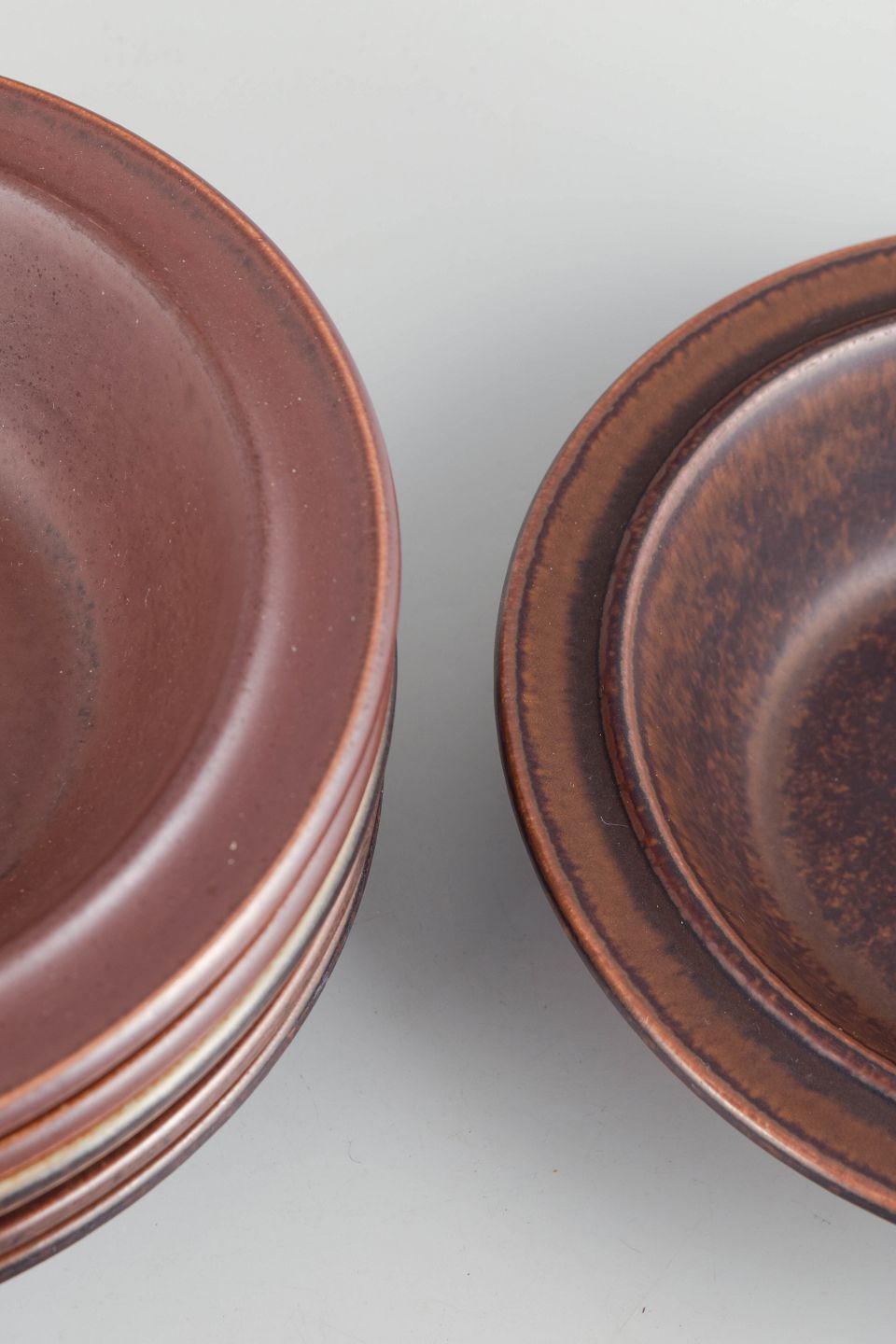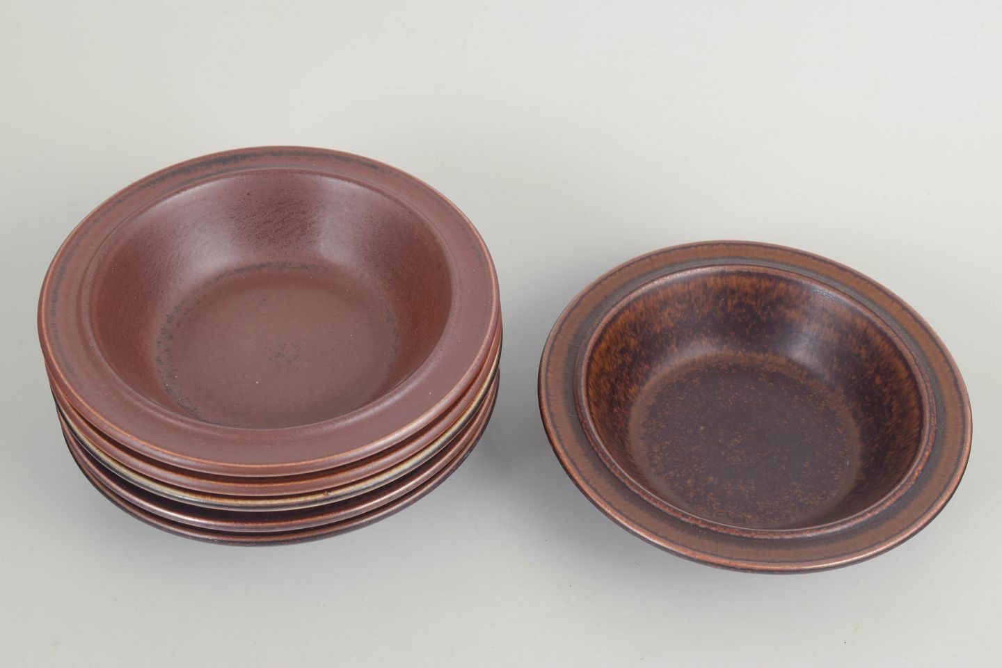 Sæt bestående af seks dybe tallerkener i stentøj fra Ruska-serien hos Arabia, udført med den karakteristiske, melerede brune glasur i varme jordtoner. Funktionel, rund form med let markeret fane og dyb kumme, velegnet til supper og pastaretter. Glasuren varierer naturligt og giver hvert stykke et individuelt udtryk.