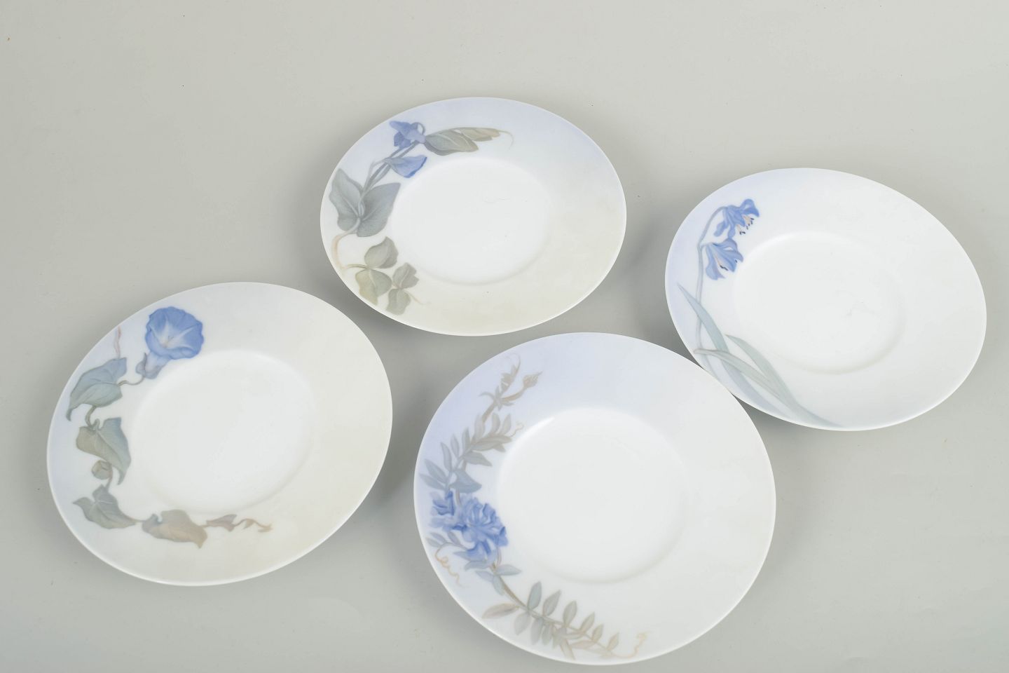 Sæt bestående på fire tallerkener i glaseret porcelæn med håndmalet underglasurdekoration i Art Nouveau-stil med stiliserede blomster- og bladmotor i afdæmpede blå og grønne nuancer.