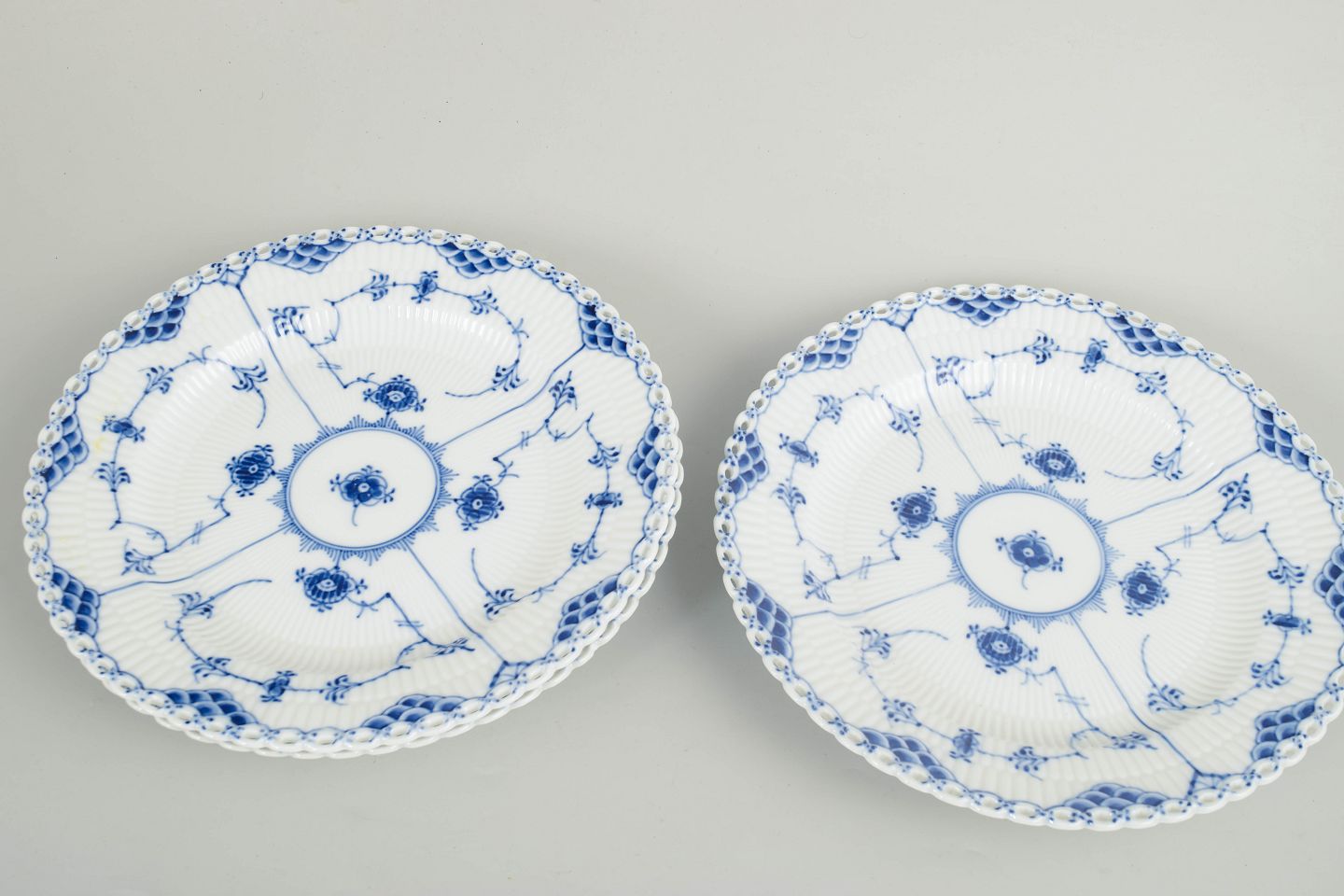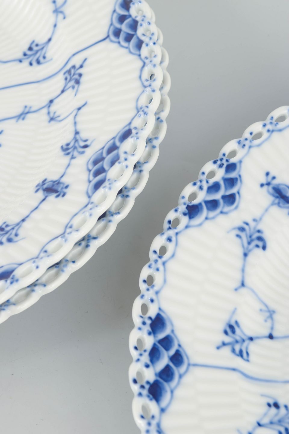 Sæt bestående af tre tallerkener i glaseret porcelæn med håndmalet underglasurdekoration i det klassiske musselmalede helblonde mønster, kendetegnet ved den gennembrudte blondekant.