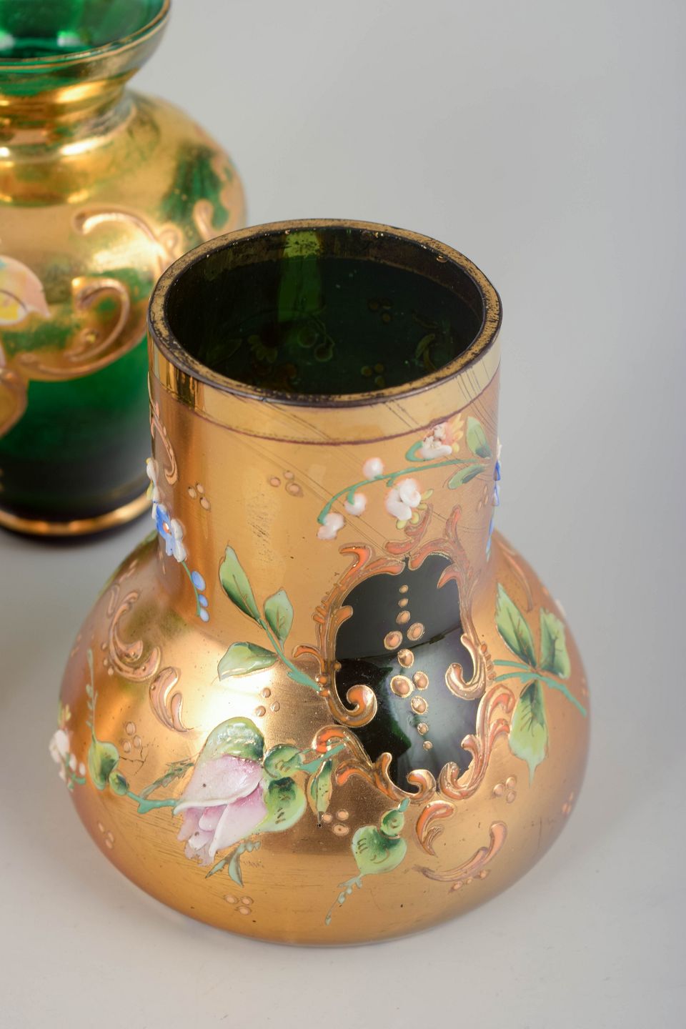 Dekorativt sæt bestående af fire dele i grønt glas med rig guldfarvet dekoration og emaljemalede blomster. Sættet omfatter en lille kande, en klokkeformet del med knop, samt to vaser i varierende former. Håndlavet arbejde udført i Bøhmen, med tydelige variationer i form og proportioner.