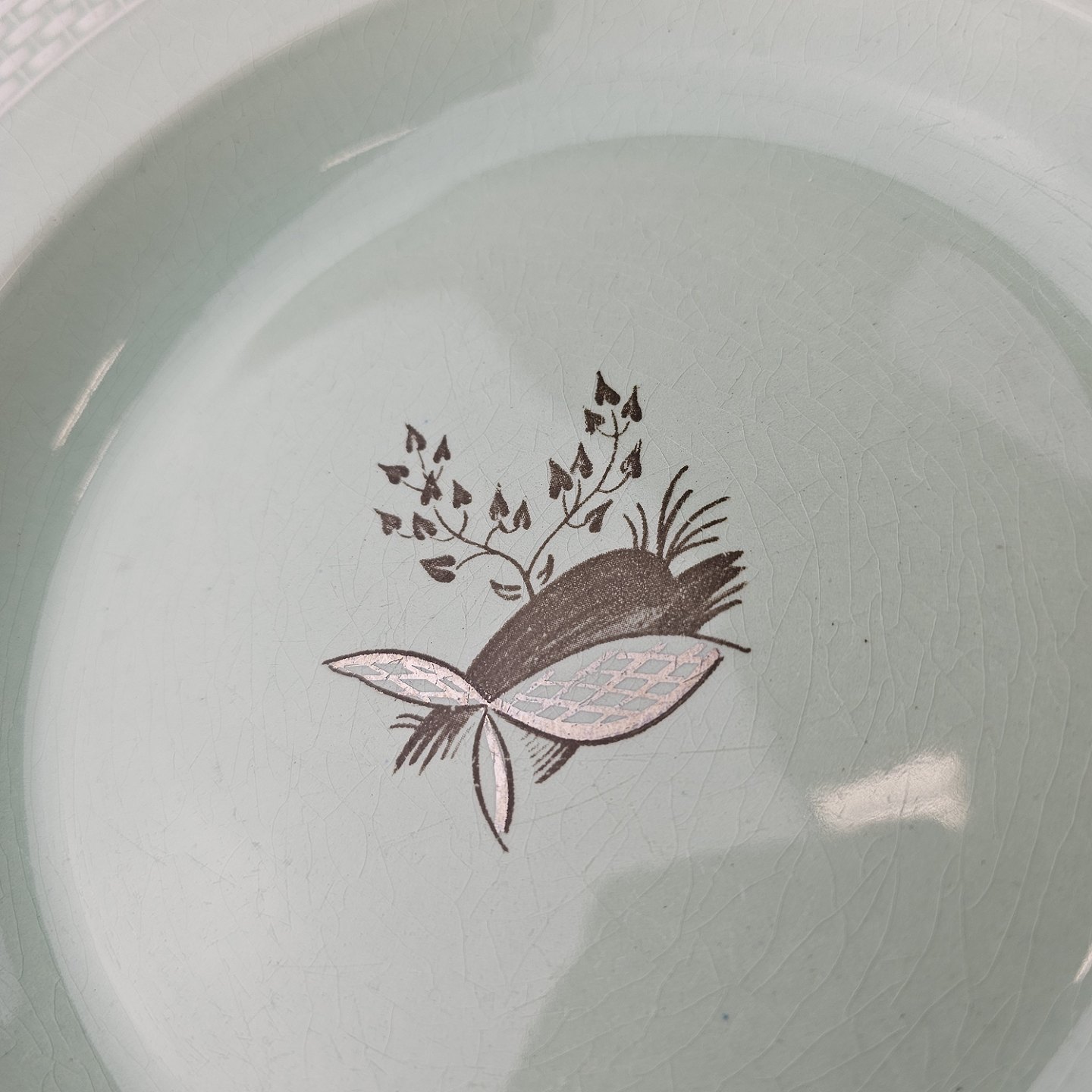 Stel i lysegrøn fajance med natur dekoration og flettet kant