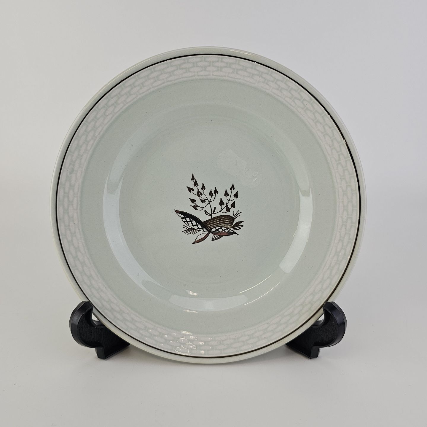 Stel i lysegrøn fajance med natur dekoration og flettet kant