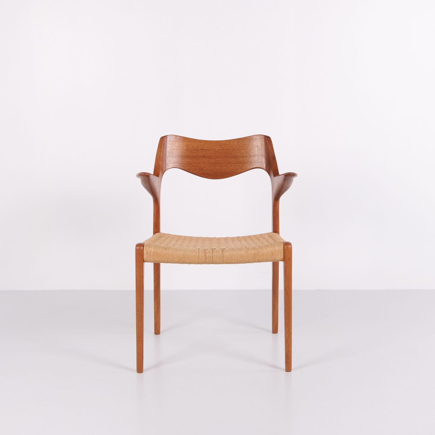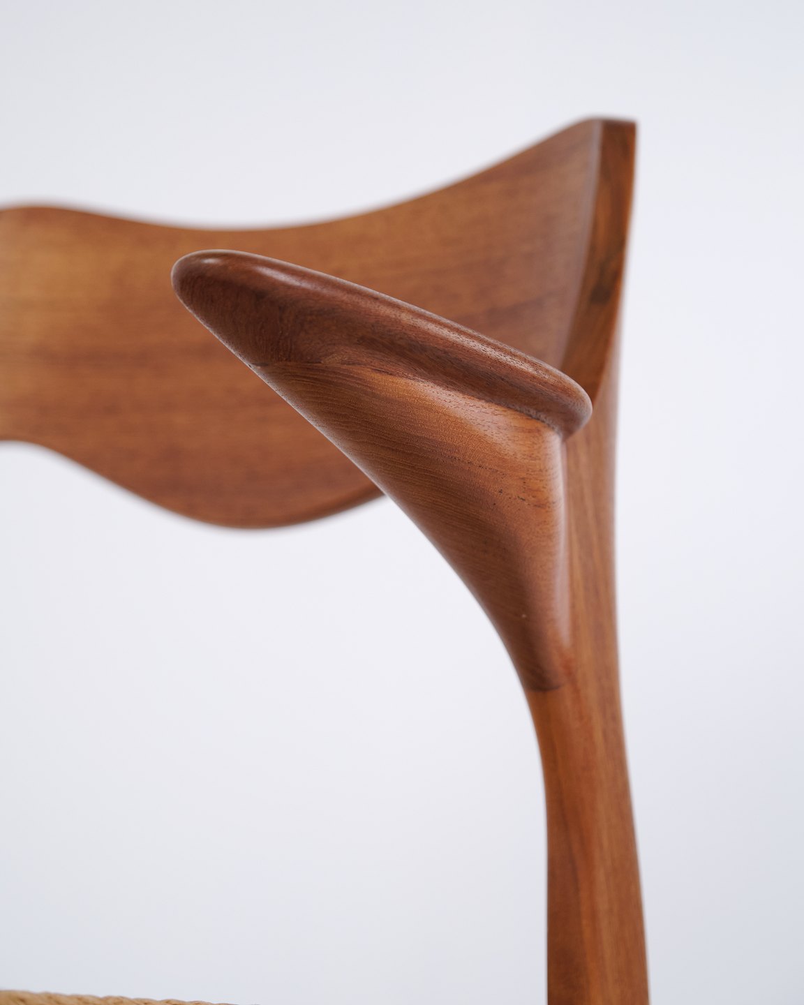 Model 55 spisebordsstol af N.O. Møller for J.L. Møllers Møbelfabrik i teak og flet fra 1960’erne. Dansk design klassiker.