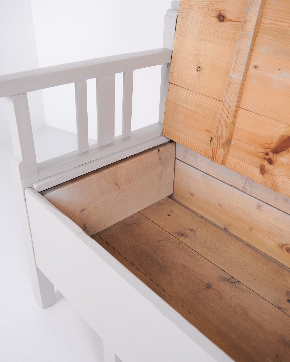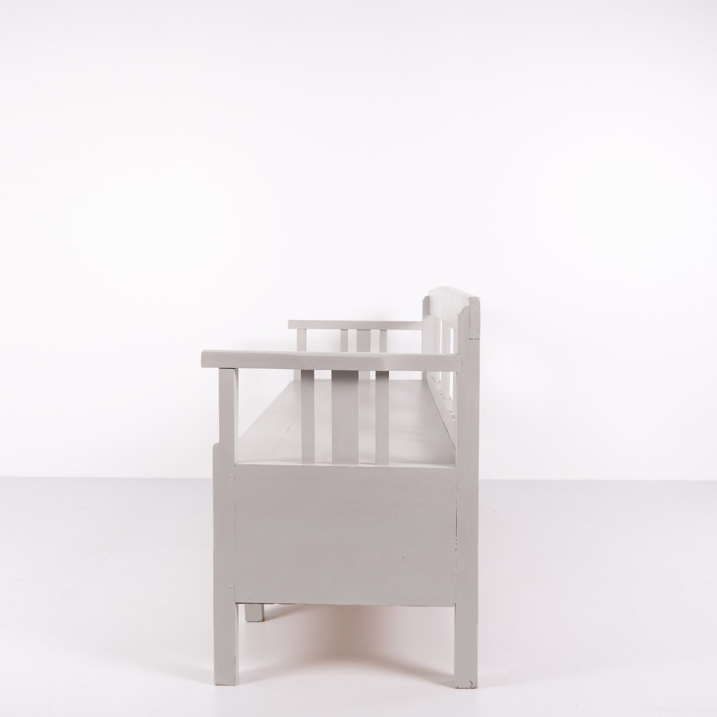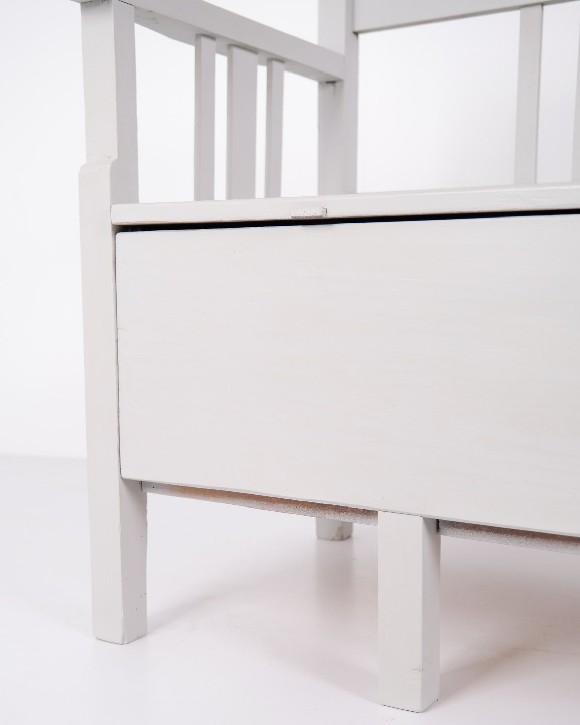 Antik slagbænk 1860’erne i gråmalet fyrretræ med opbevaring. Antik opbevaringsbænk 1800-tallet.