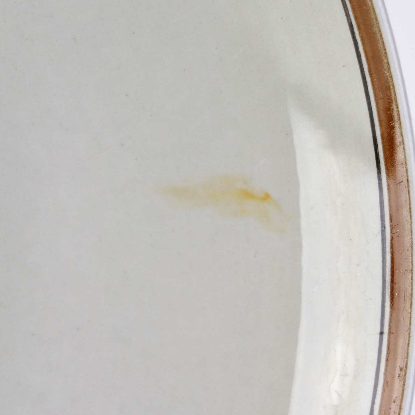Fremstår med tre mindre misfavninger under glasuren, sorte nister og ujævnhed i glasuren.