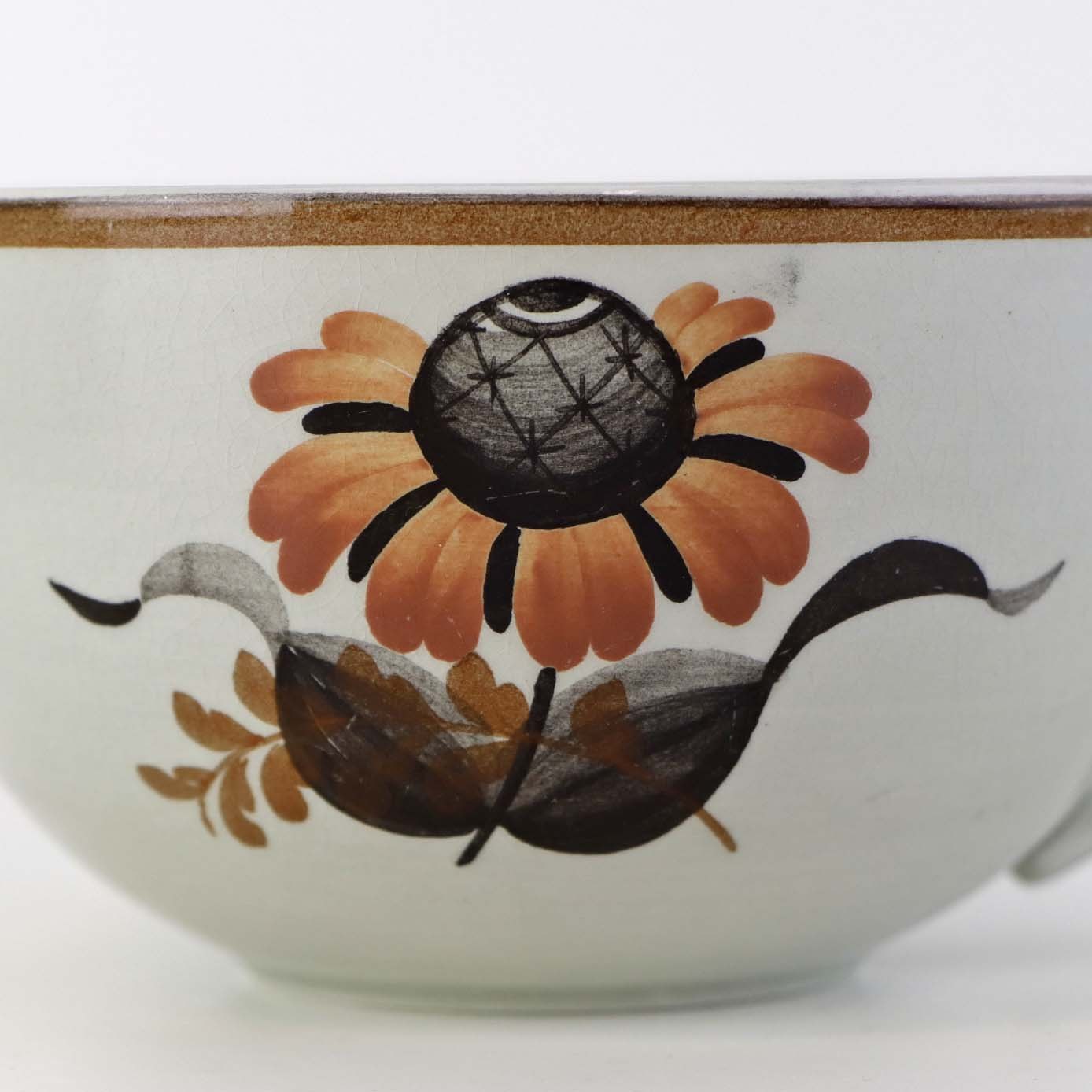 Fajancestellet er i stelformen Viktoria II med dekoration af orangebrune blomster på gråtonet baggrund med brun kant.