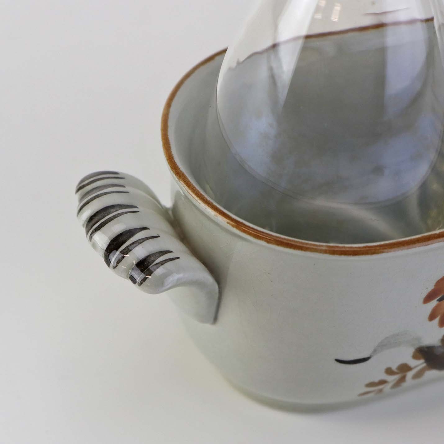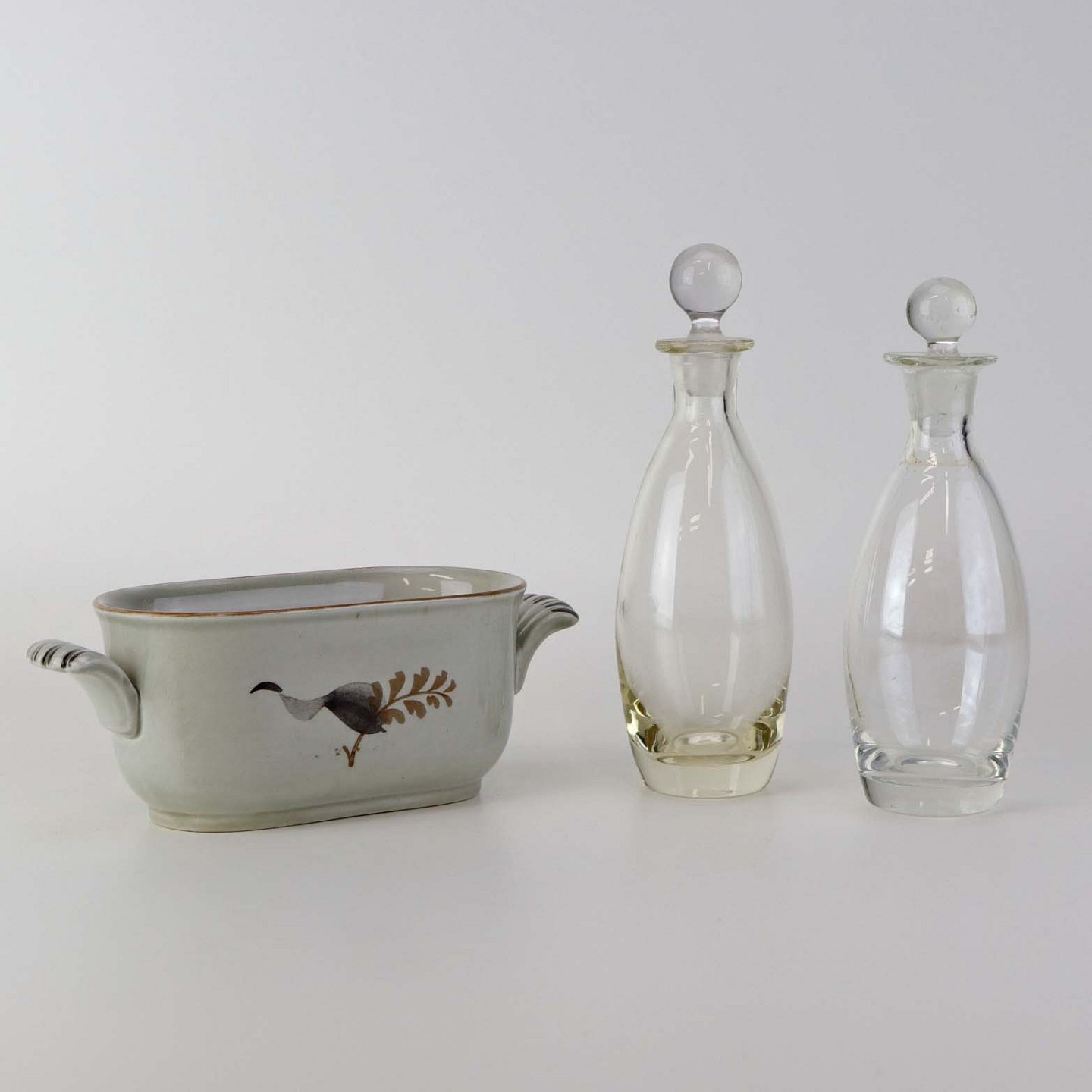 Sæt med to glasflasker til olie og eddike med prop i kar med hanke af fajance fra stellet Kirsten, som blev fremstillet i perioden 1934-1957.