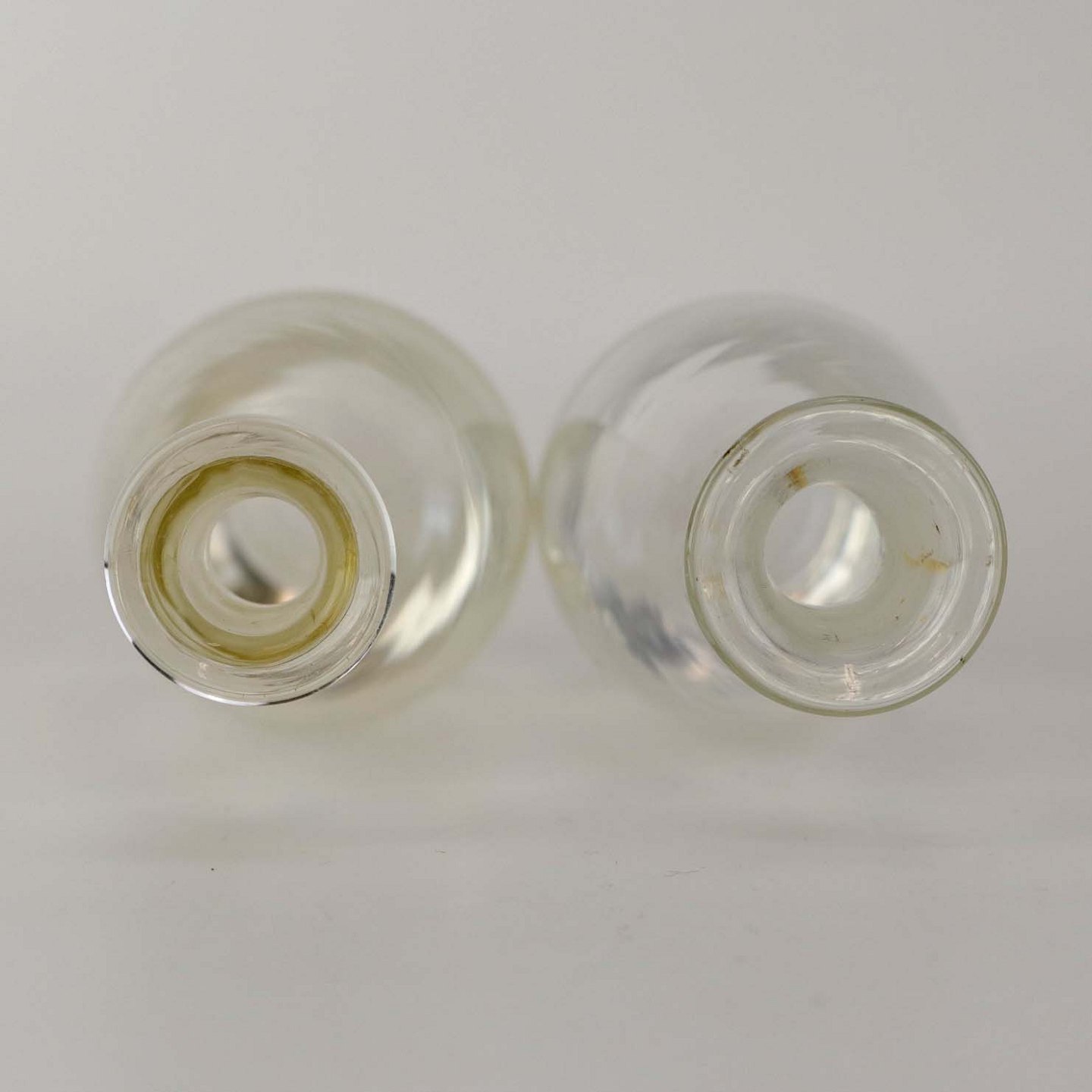 Fremstår med brugsspor glas ved den ene flaskehals.