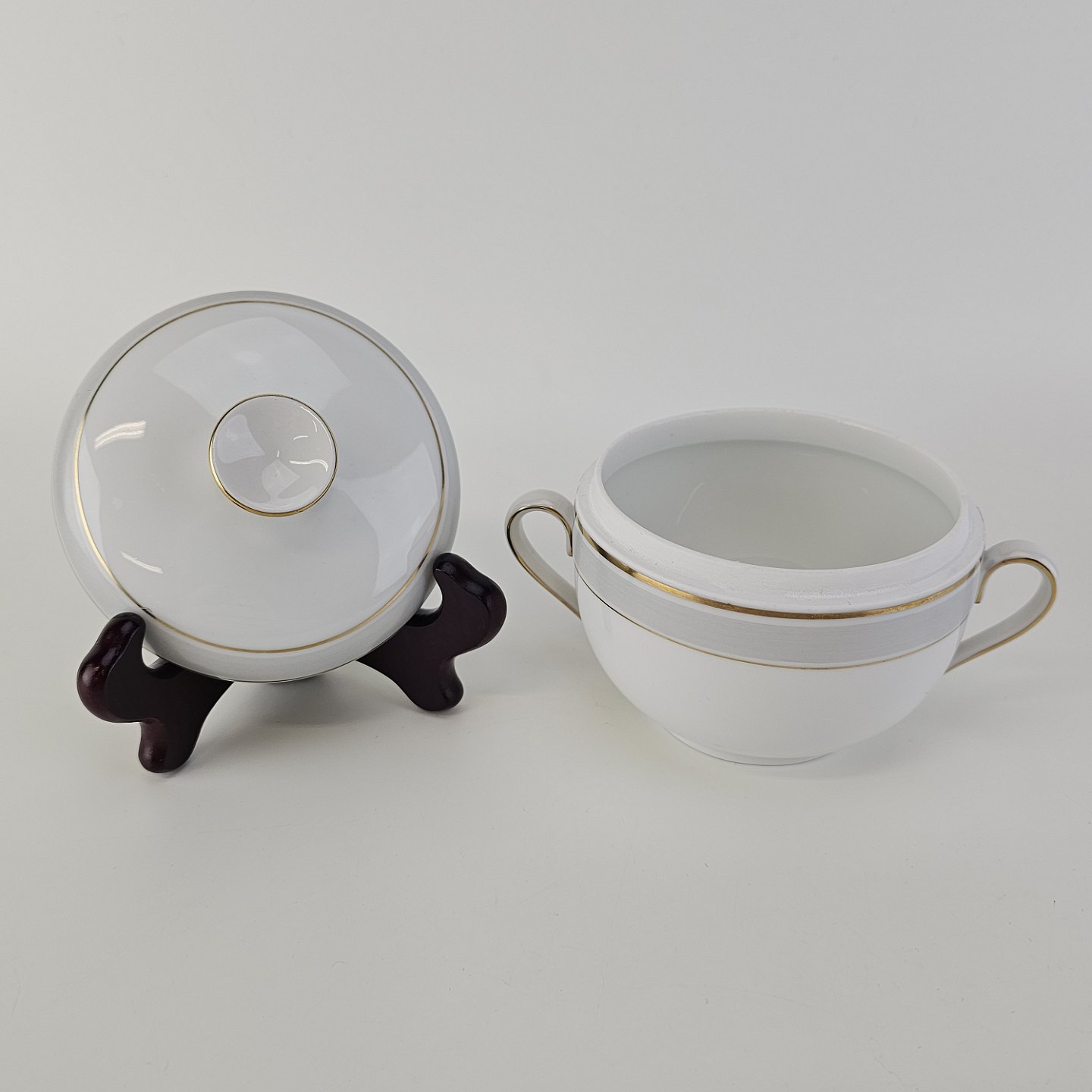Tiber er stel i glat hvidt porcelæn med grå bort og guldkant