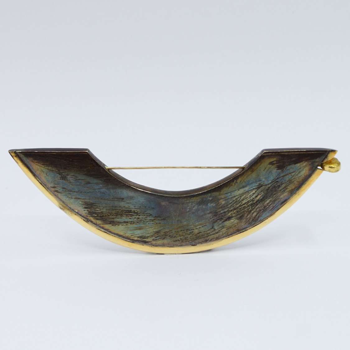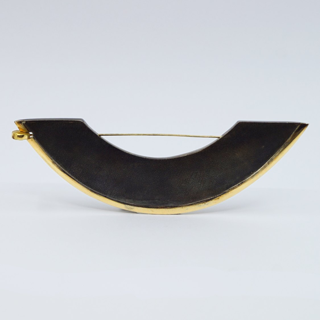 Anette Kræn; Stor kraftig sølv broche med oxideret overflade og 14 kt. guld. Kan vendes på to forskellige måder, med hver sit udtryk.