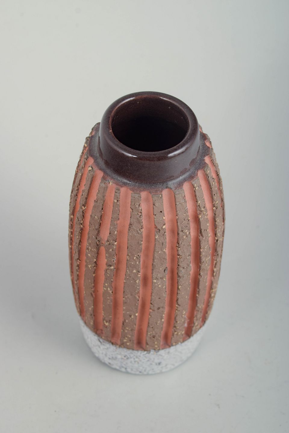 Lille cylindrisk vase i glaseret keramik med let indsnævret hals. Korpus er dekoreret med lodrette, reliefopbyggede striber i terrakottafarvede toner mod en mørkere, let spraglet bundglasur, afsluttet med en lys, groft struktureret fod. Dekorationen giver et markant taktilt og modernistisk udtryk. Modelnummer 4594.
