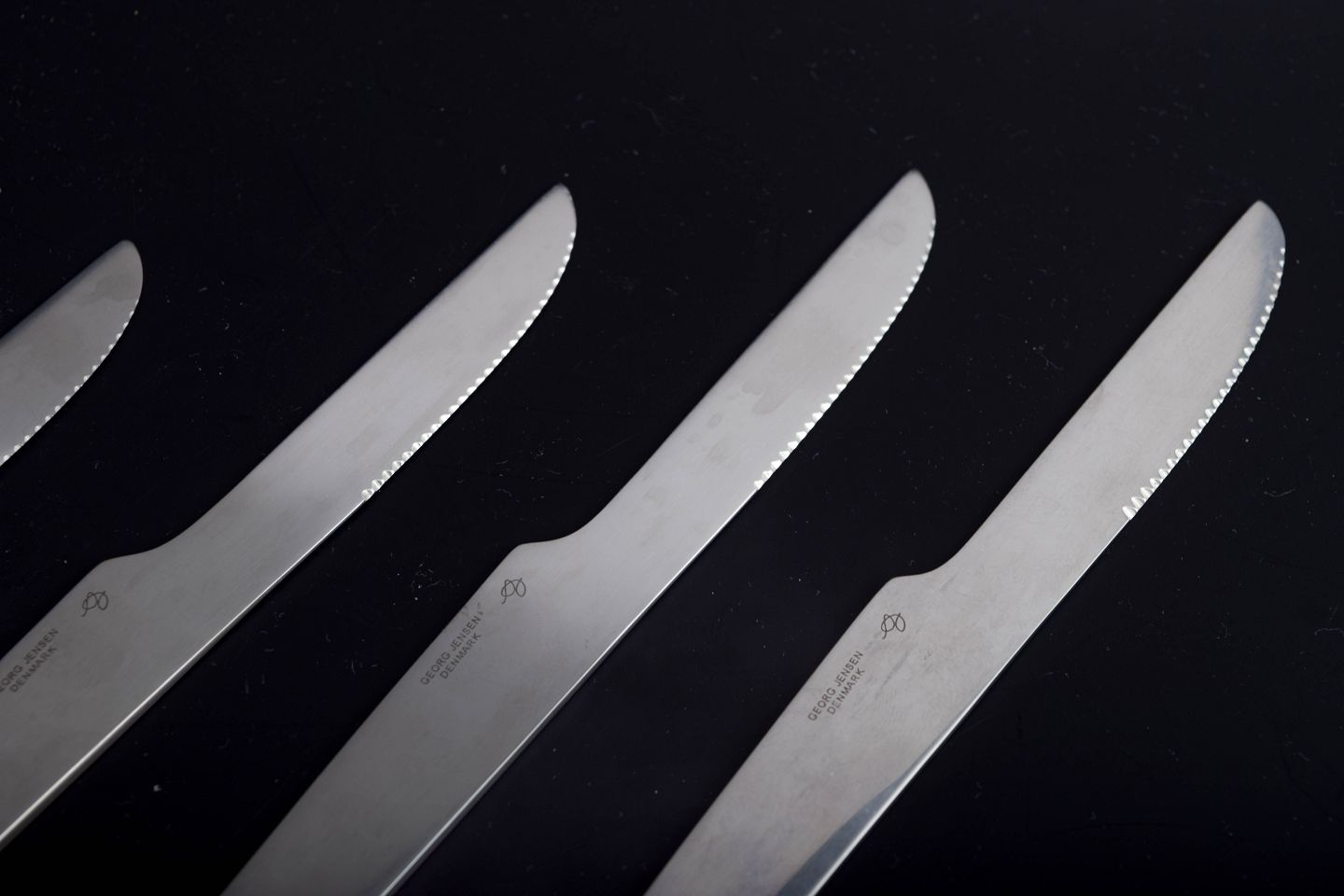 Sæt bestående af fem middagsknive i rustfrit stål. Knivene er udført i et stramt og funktionelt formsprog karakteristisk for Arne Jacobsens bestikdesign og produceret af Georg Jensen. Modellen er fra 1980’erne.