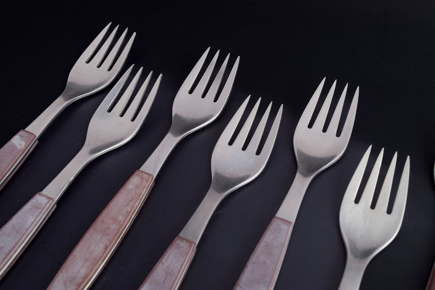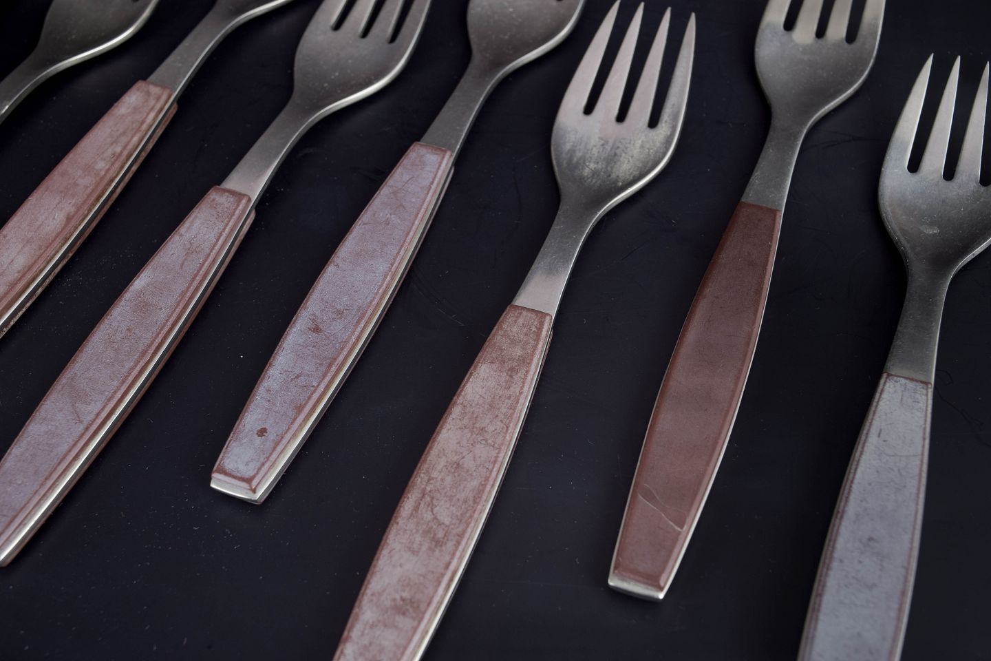 Sæt bestående af otte middagsgafler i rustfrit stål med brune håndtag. Modellen er fra Strata-serien.