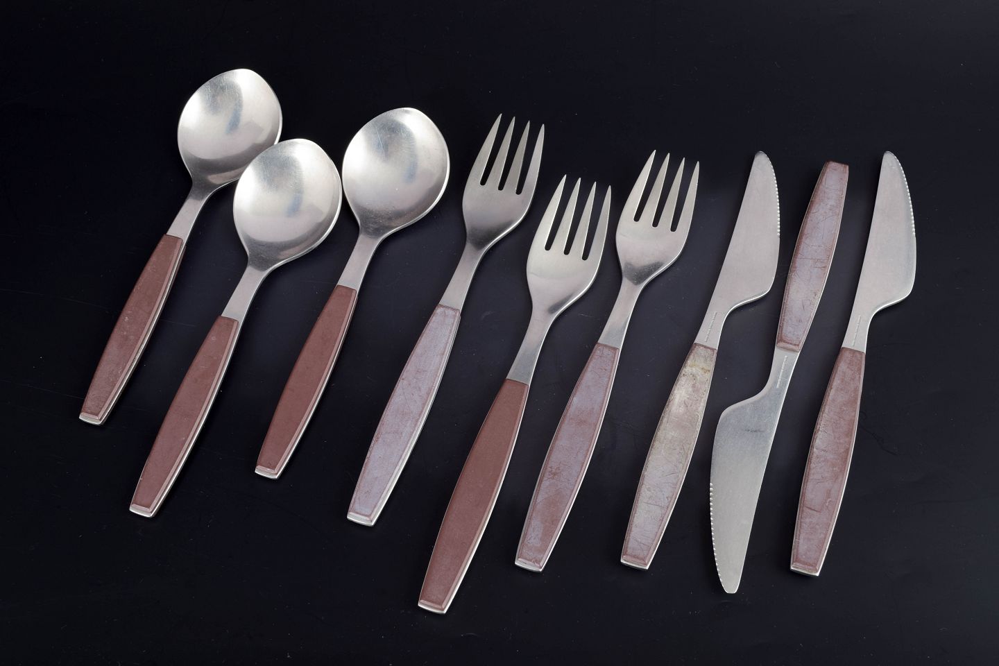 Sæt bestående af tre middagsknive, tre middagsgafler og tre spiseskeer i rustfrit stål med brune håndtag. Modellen er fra Strata-serien.