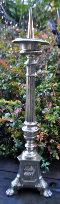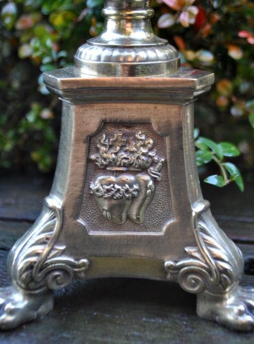 Fransk messing kirke stage, 19. årh. På trekantet fod med løvefødder med motiv af Jesus, Jomfru Maria og brændende hjerter. Stemplet: LF a Paris. H: 46 cm. B: 12,5 cm.
