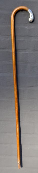 Stok i træ med sølvbeslag, 20. årh. Danmark. Stemplet: 830 S. Indgraveret: DA 25/6 19. L: 92 cm.