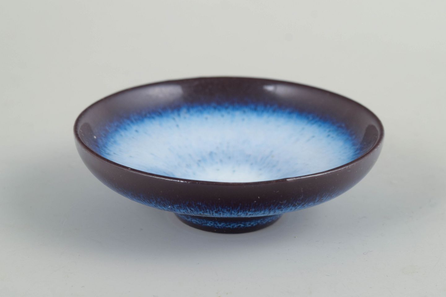 Lille lav skål i glaseret stentøj med blødt rundet form. Udført med mørk rand og lys, levende blå glasur i midten, karakteristisk for Gunnar Nylunds eksperimenterende glasurarbejder i mindre formater. Skalaen og proportionerne understreger skålens miniaturekarakter.