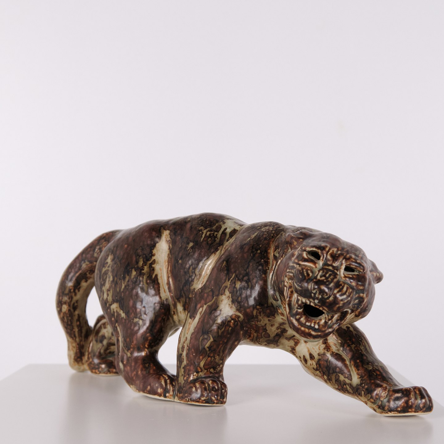 Stentøjsfigur med motiv af panter, model 20283, designet af Knud Kyhn for Royal Copenhagen. Figuren er udført i stentøj og er et karakteristisk eksempel på Knud Kyhns arbejde med dyrefigurer, hvor fokus ligger på kropsform, bevægelse og materialets overflade. Modellen er produceret hos Royal Copenhagen og er efterspurgt inden for dansk keramik fra midten af det 20. århundrede.